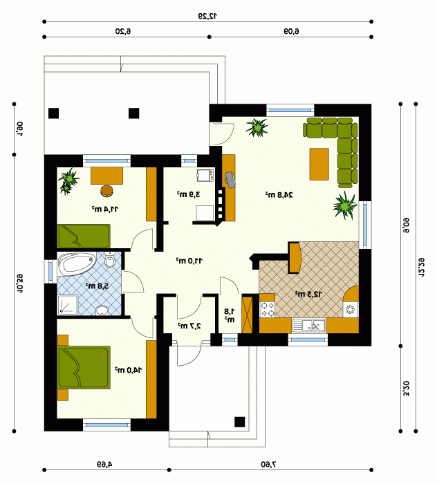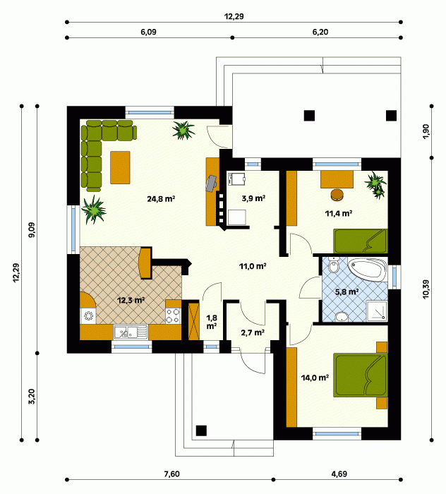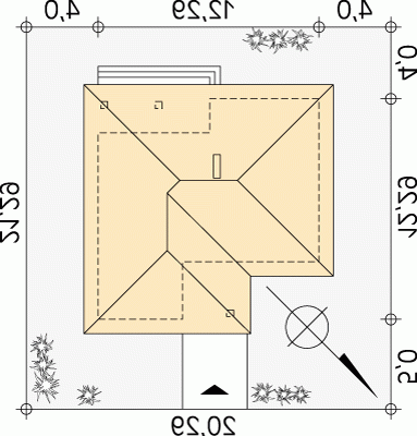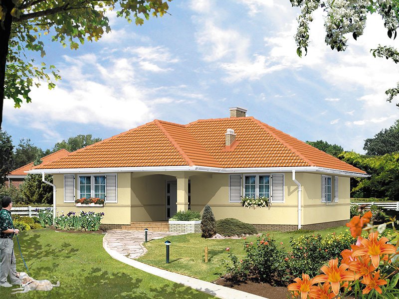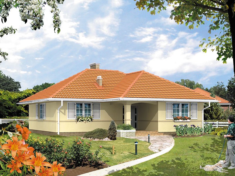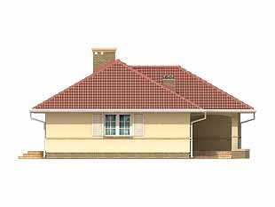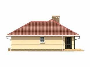 Budynek mieszkalny, jednorodzinny, parterowy. Przeznaczony do zamieszkania dla 3-osobowej rodziny. Niewielki dom o prostej konstrukcji i czytelnym układzie funkcjonalnym. Na parterze zaprojektowano dwa pokoje mieszkalne, łazienkę, kuchnię z jadalnią i pokój dzienny z kominkiem.