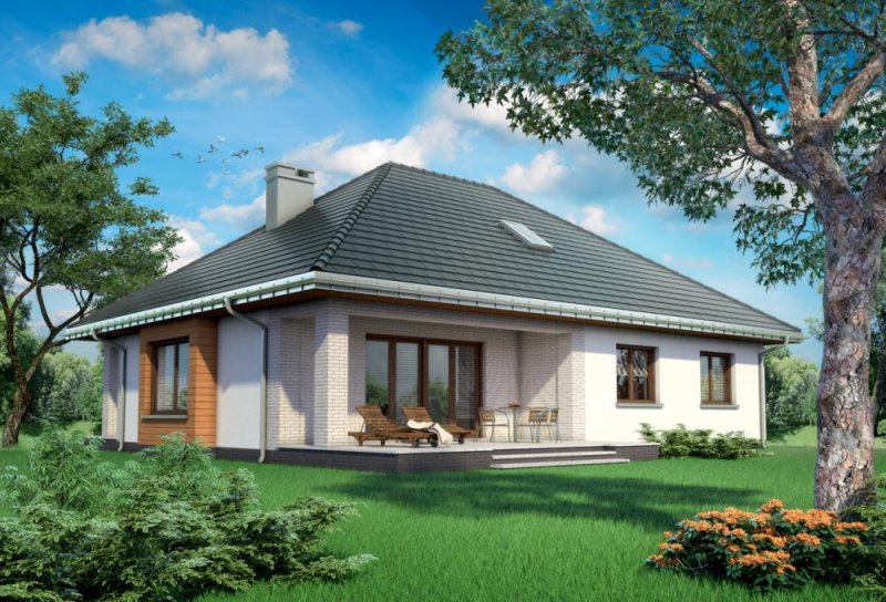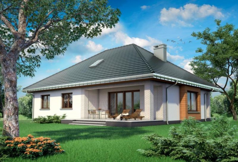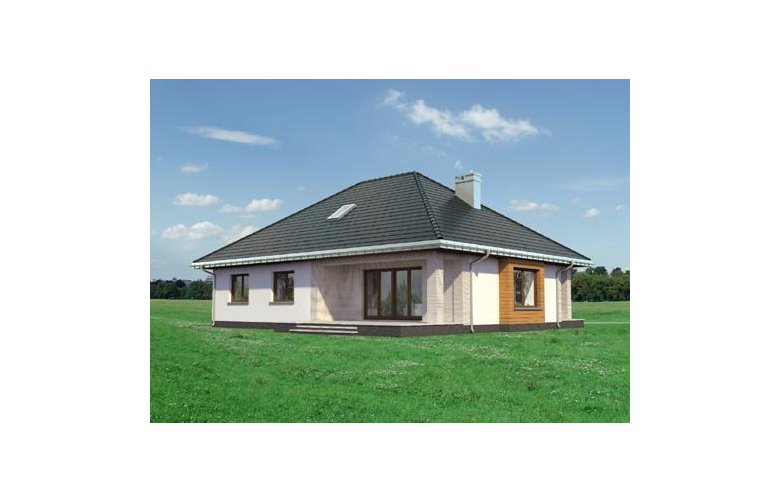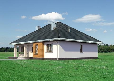 Rodzina Reginy to projekt domu parterowego dla 4 osób, o pow. ok 120m2, bez garażu w kilku rozwiązaniach funkcjonalnych i architektonicznych Wszystkie mają bryłę na planie prostokąta, podciętego od frontu i od ogrodu tarasami osłoniętymi głębokimi okapami na słupach. Wnęki obejmują otwartą na hol część dzienną mieszkania z wyjątkowo dużym salonem. Projekt domu Regina Rex i Regina Ultra proponują częściowe przesłonięcie kuchni ze spiżarnią kominkiem. Strefa prywatna z dużą łazienką położona jest w głębi holu i odseparowana od części wejściowej zespołem małej łazienki i kotłowni z pralnią dostępnej z sieni. Rodzina Reginy to budynki z czterospadowym dachem, z kalenicą równoległą do drogi dojazdowej. Proponują różne warianty nachylenia połaci i wykorzystania poddasza. Projekt Regina Rex, ze spadkiem 35°, oferuje nad parterem przestrzeń nieużytkową. Chroni ona mieszkanie przed czynnikami atmosferycznymi i buduje znaczną kubaturą tradycyjny zarys sylwetki. Jasne elewacje skomponowano podkreślając fakturą klinkieru wnęki podcieni, a drewnianą boazerią ryzalit jadalni i węzeł gospodarczy przy wejściu.