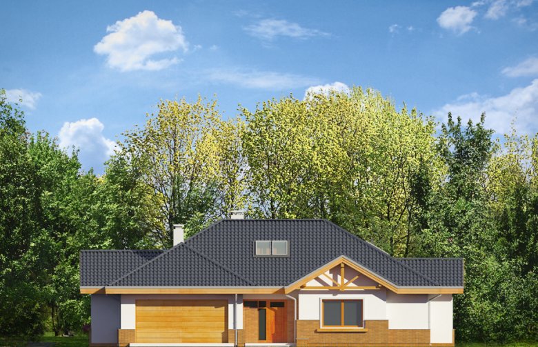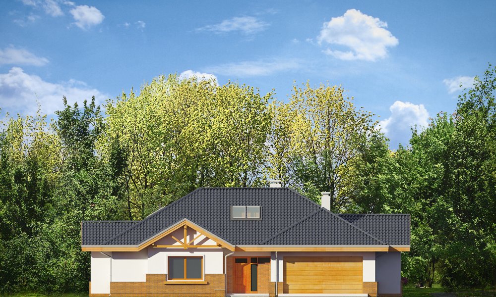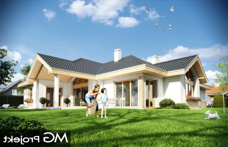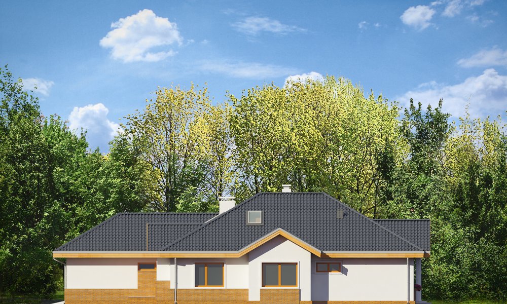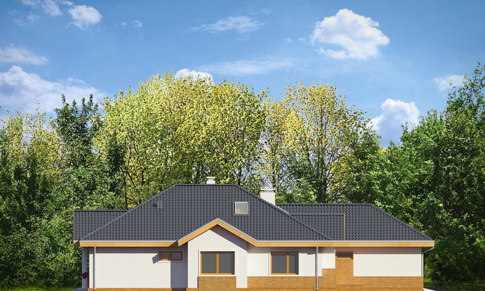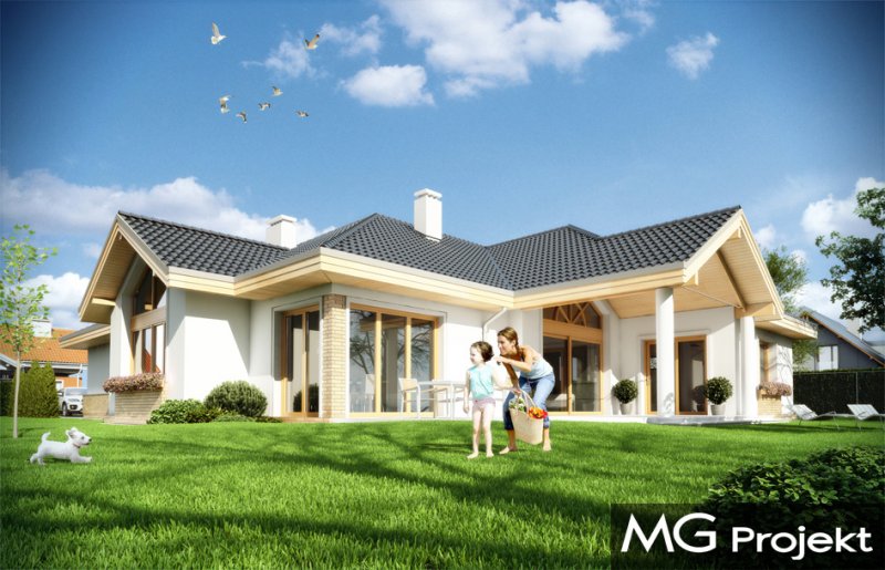 Rozłożysty to fantastyczna komfortowa willa, łącząca w sobie elementy nowoczesności i tradycyjnej formy. Dom jednorodzinny przeznaczony dla cztero-pięcioosobowej rodziny. Parterowy układ funkcjonalny, gdzie wszystkie pomieszczenia dostępne są z jednego poziomu, rozczłonkowana bryła przykryta łagodnymi dachami, część dzienna z wysokimi sufitami sięgającymi dachu, bliskość wnętrza z otaczającym ogrodem - to wszystko powoduje, że dom będzie wspaniałym miejscem do życia. Każda elewacja jest ciekawa i oryginalna. Front domu, z wykuszem zakończonym daszkiem, oraz mini-dziedzińcem wejściowym, z eleganckimi drzwiami z naświetlem. Elewacja ogrodowa z pięknym zadaszonym tarasem i przeszkleniami salonu. Nawet elewacje boczne – z dodatkowymi wykuszami są interesujące. W elewacjach zastosowano tradycyjne elementy z użyciem współczesnych detali. Dom ma solidny wygląd, a jednocześnie jest bardzo świeży i nowoczesny. Budynek doskonale wpasuje się w niemal każdy teren - najlepiej będzie wyglądał na większej działce, w otoczeniu rzadszej zabudowy. Projekt obejmuje – na parterze: część dzienną – z salonem, jadalnią, kuchnią i holem, część nocną – z czterema pokojami, oraz część gospodarczą - z garażem i kotłownią. Prócz tego można dowolnie wykorzystać przestrzeń strychu - jako zamknięty magazyn, lub jako otwartą na salon antresolę (na przykład pokój sportowy, czy hobby). Fenomenalną przestrzeń dzienną, z pustką nad salonem i kuchnią zobaczyć można na naszych wizualizacjach wnętrz. Budynek przez rozległy plan i spory dach nie będzie z pewnością najtańszy w realizacji, ale na pewno wart jest szaleństwa. Szczególnie jeśli już mieszkało się wcześniej w domu i spędziło pół życia biegając po schodach i nie wykorzystując w pełni wyższych kondygnacji. Zastosowane energooszczędne materiały, izolacje i instalacje sprawią, że dom nie będzie drogi w utrzymaniu. Pracownia posiada odbicie lustrzane projektu.