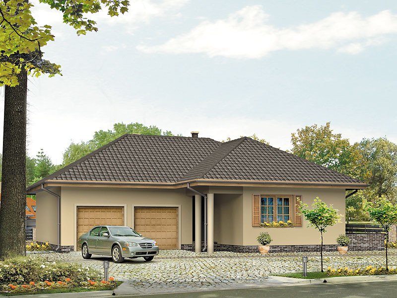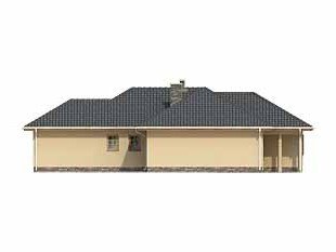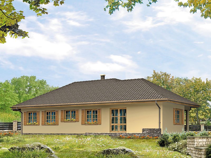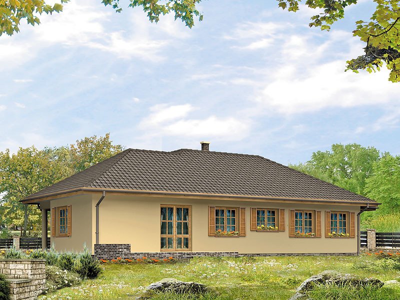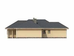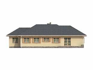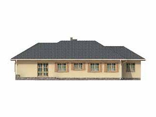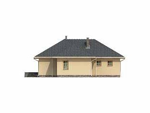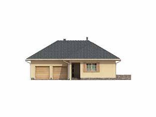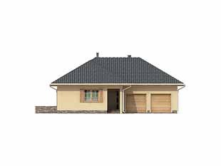 Parterowy, niepodpiwniczony dom bez poddasza. Dom na wąską działkę z wejściem od strony południowej. Wydzielona część nocna z sypialniami, garderobami i łazienką. Jadalnia w wykuszu połączona z kuchnią.