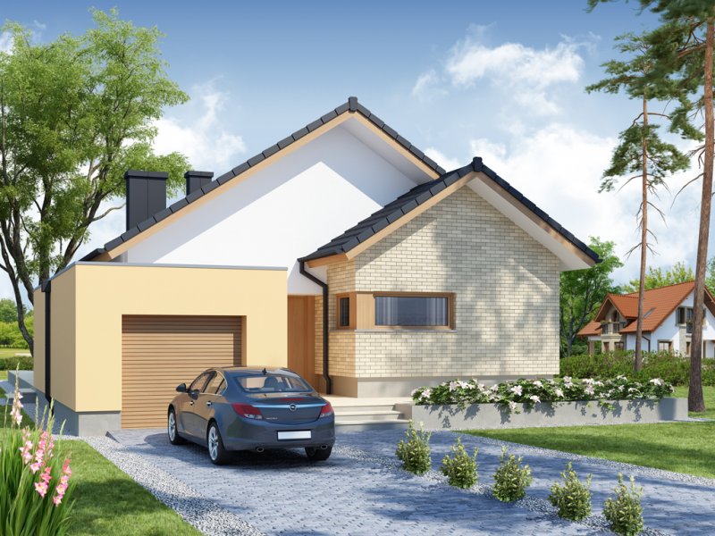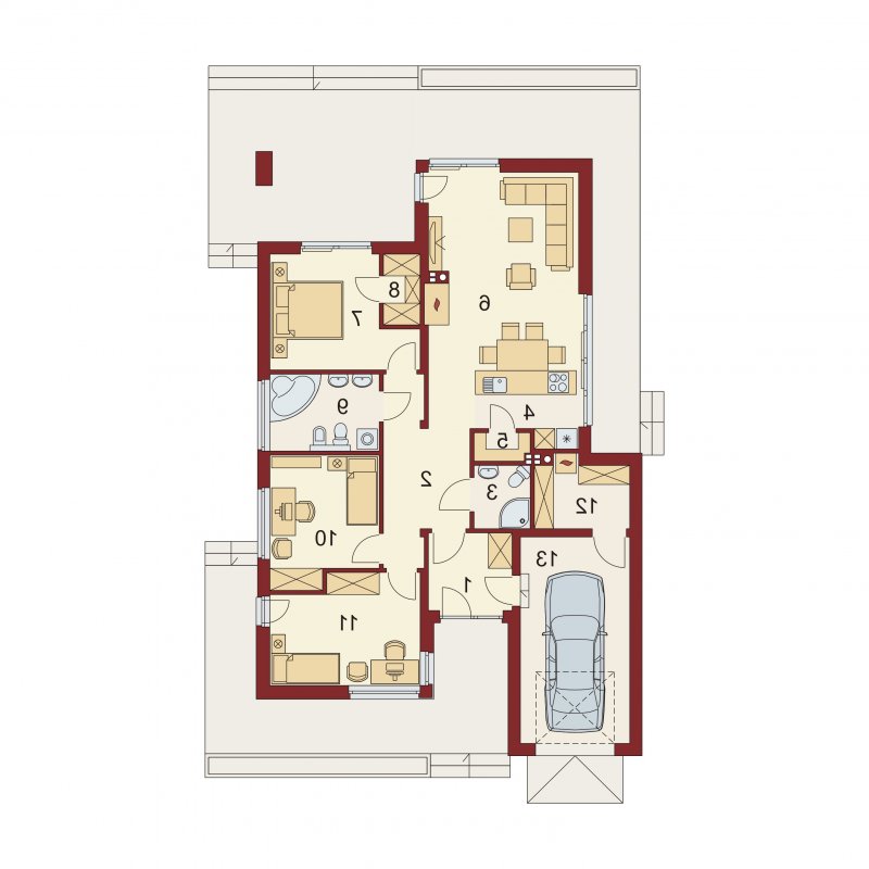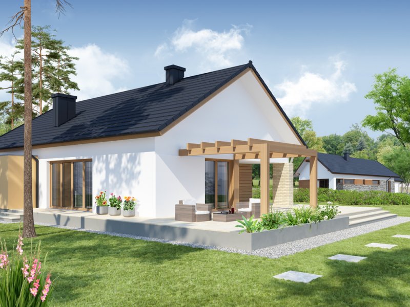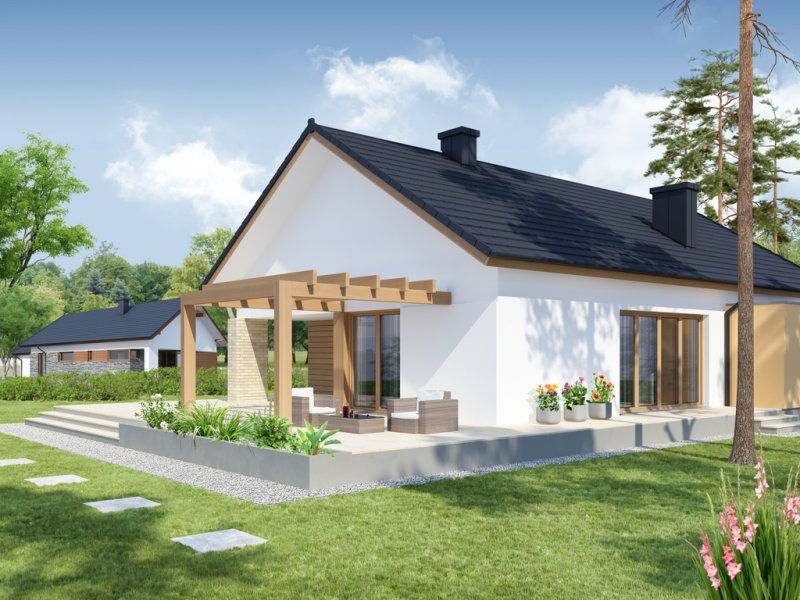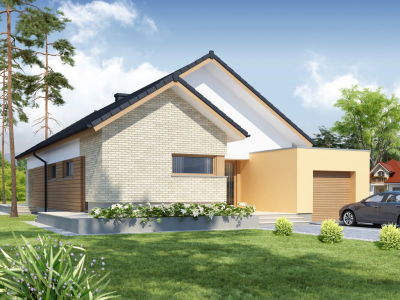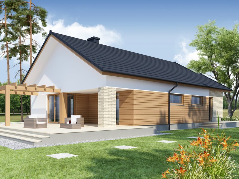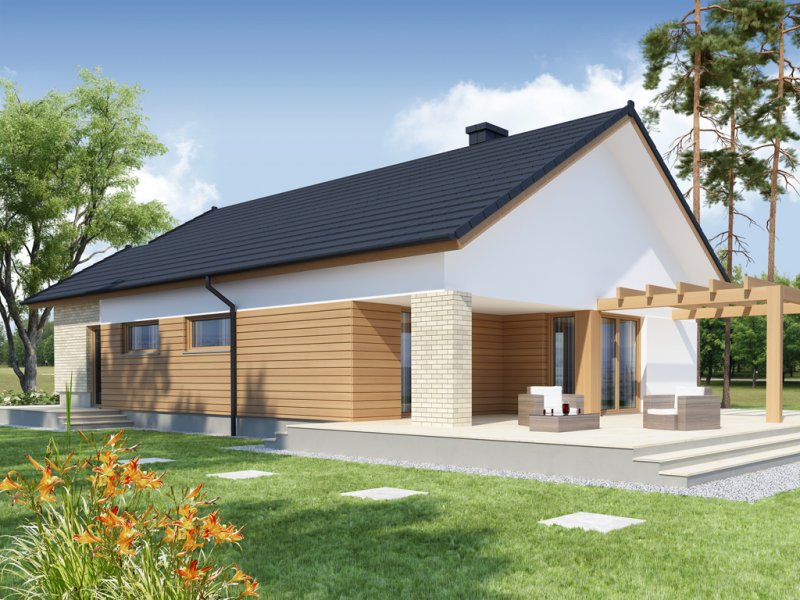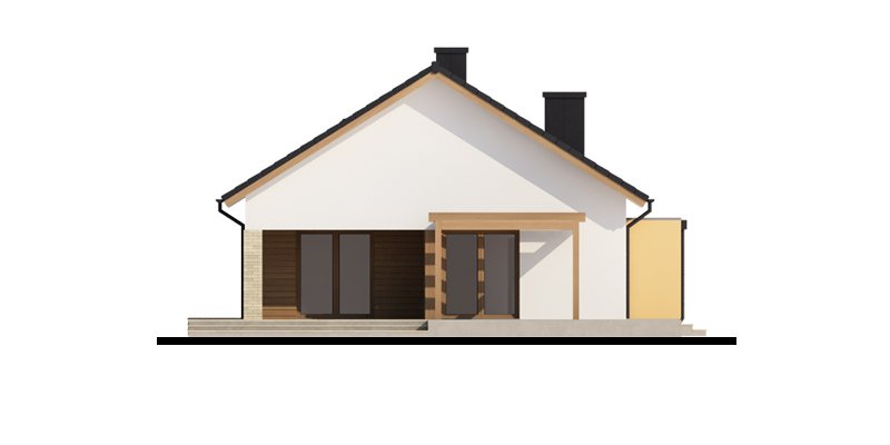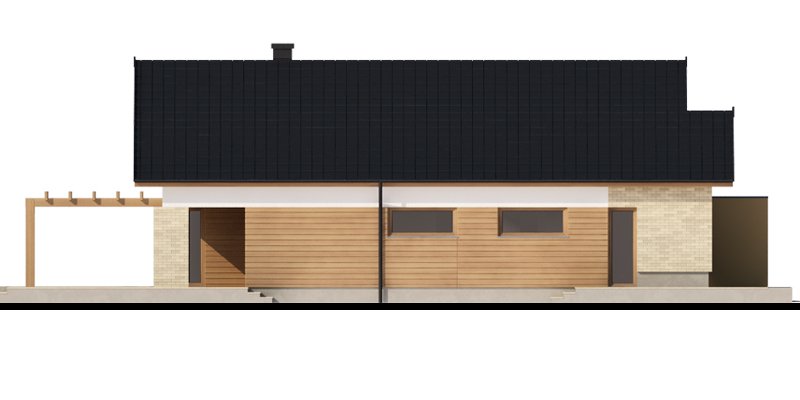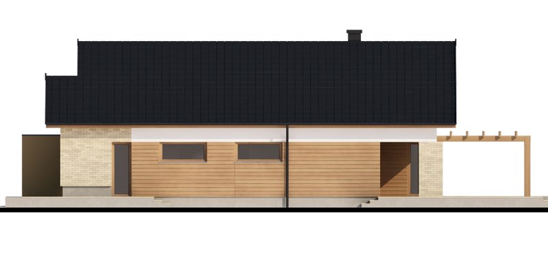Sergiusz jest domem parterowym o nowoczesnej bryle. Bardzo dobrze wpisuje się w wąskie działki. Zwraca uwagę wyraźny podział na strefy funkcjonalne: odseparowane od siebie dzienna i gospodarcza usytuowane są z jednej strony domu, nocna - z drugiej. Salon, jadalnia i kuchnia tworzą jednorodną otwartą przestrzeń . Duże przeszklenia gwarantują doskonałe doświetlenie wnętrza, widok na część ogrodową i możliwość wyjścia na taras zarówno z części kuchennej, jadalnianej, jak i salonu. Istnieje możliwość powiększenia kuchni kosztem spiżarni. Pomieszczenie gospodarcze dostępne jest z jednostanowiskowego garażu, do którego z kolei możemy wejść bezpośrednio z wiatrołapu. Pomieszczenie gospodarcze możemy również powiększyć decydując się na likwidację sąsiadującej z nim łazienki, dając jednocześnie możliwość wejścia od strony mieszkalnej domu. Strefę nocną stanowią trzy sypialnie, w tym jedna z garderobą i bezpośrednim wyjściem na zadaszony taras.