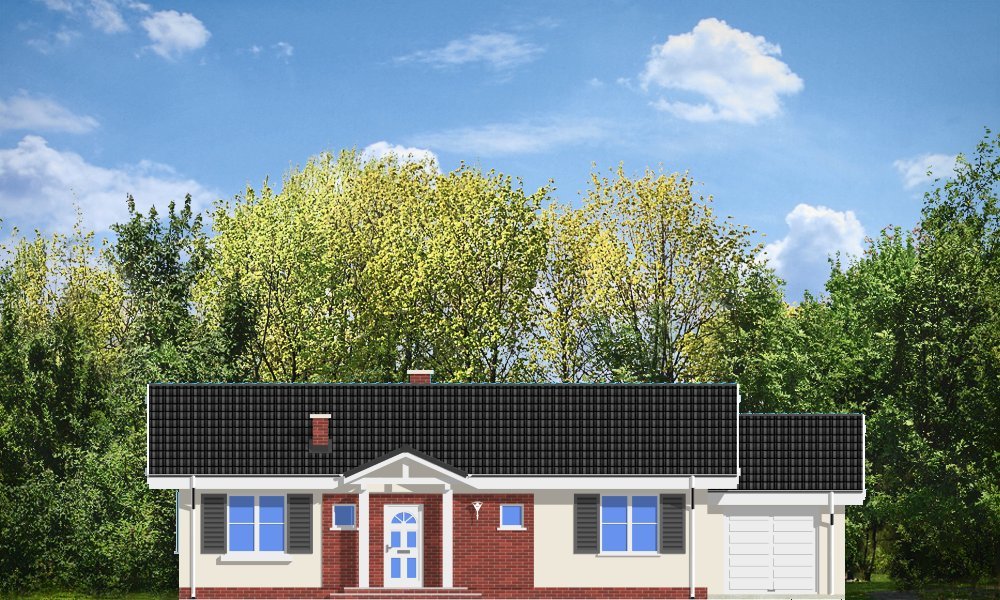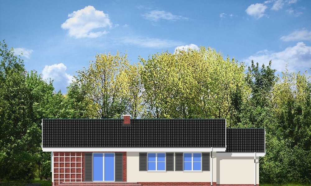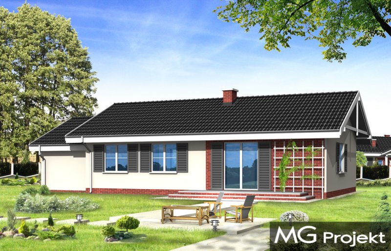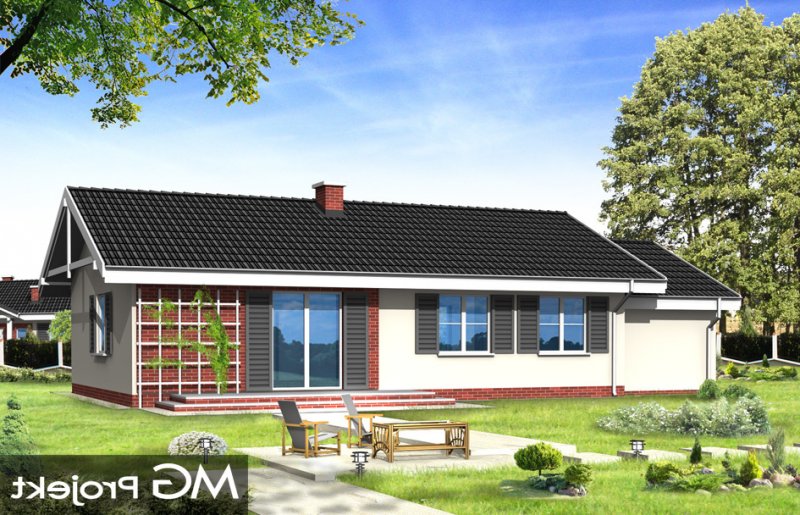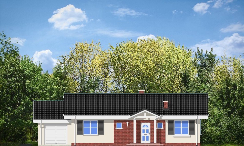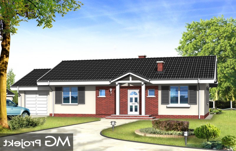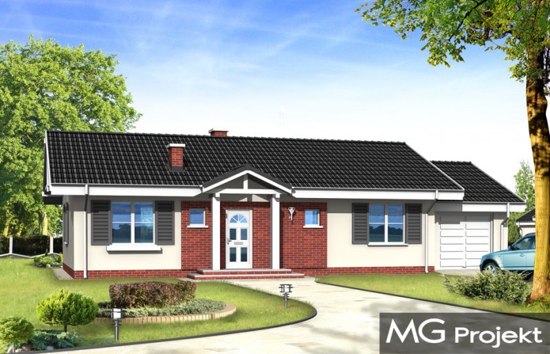 Słoneczny z garażem to budynek o prostej bryle, łatwy i tani w budowie. Dom jednorodzinny zaprojektowany z myślą o potrzebach rodziny czteroosobowej. Na niewielkiej powierzchni udało się zaprojektować wszystkie niezbędne w domu pomieszczenia oraz garaż. Pokój dzienny połączony przestrzennie z holem, aneksem jadalnym i częściowo otwartą kuchnią, tworząc w ten sposób duże jednoprzestrzenne wnętrze. Sypialnie z łazienką i oddzielnym wc tworzą strefę nocną mieszkania. Wygląd zewnętrzny projektu określają bezpretensjonalny detal i dobrze dobrane proporcje. Pracownia posiada również projekt w innych wariantach, np.: bez garażu, z dachem wielospadowym. Dostępne jest odbicie lustrzane projektu.