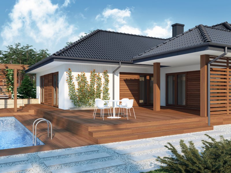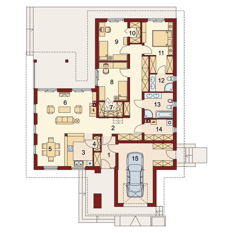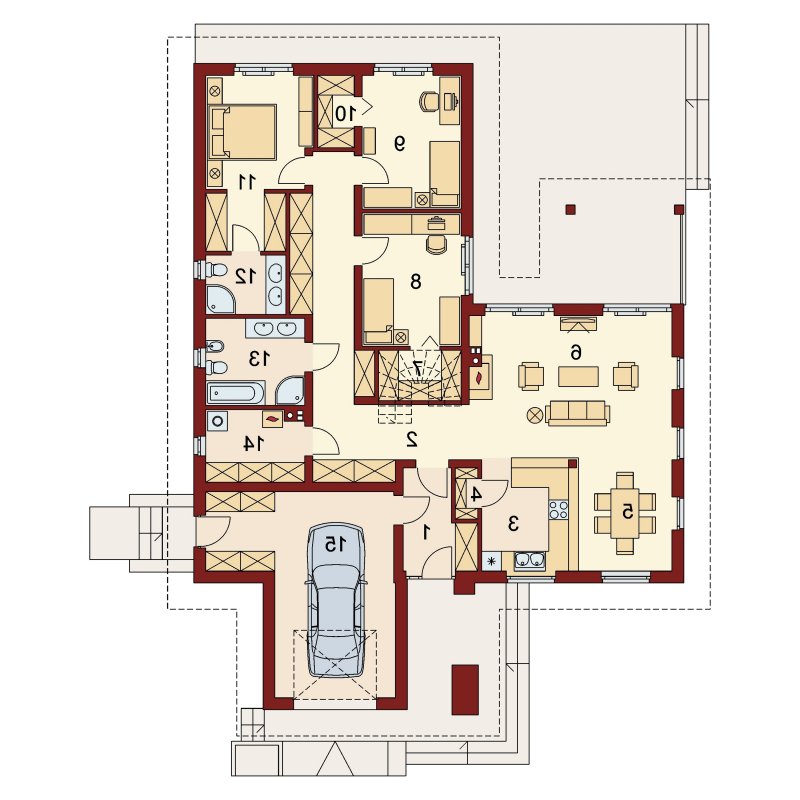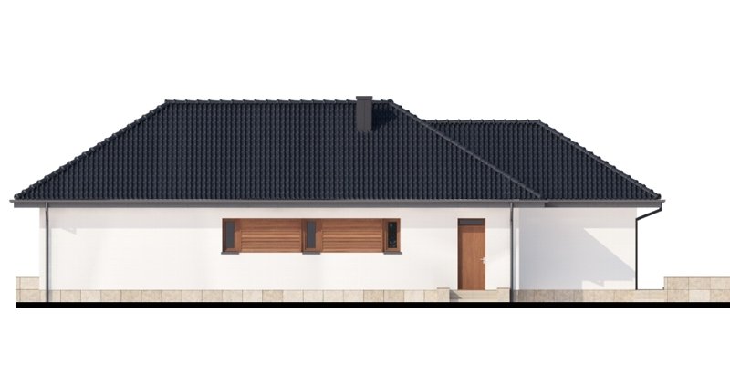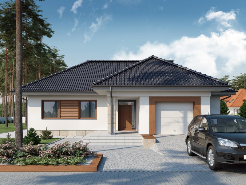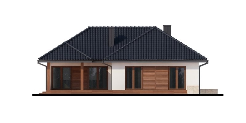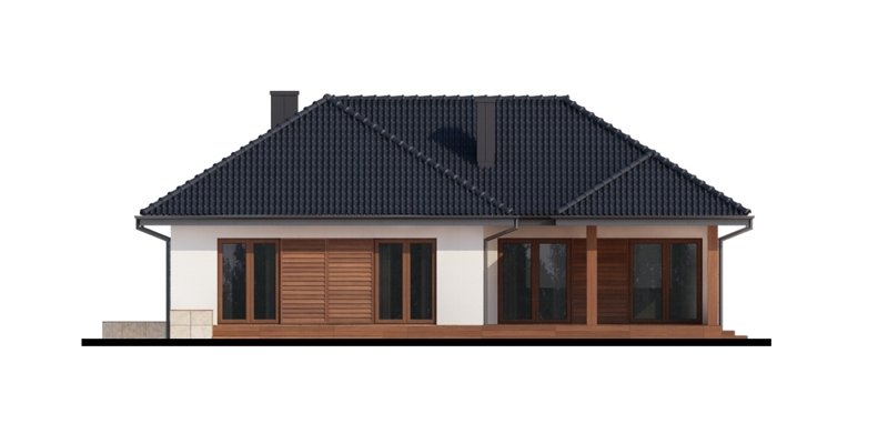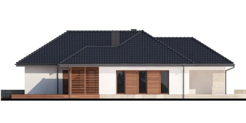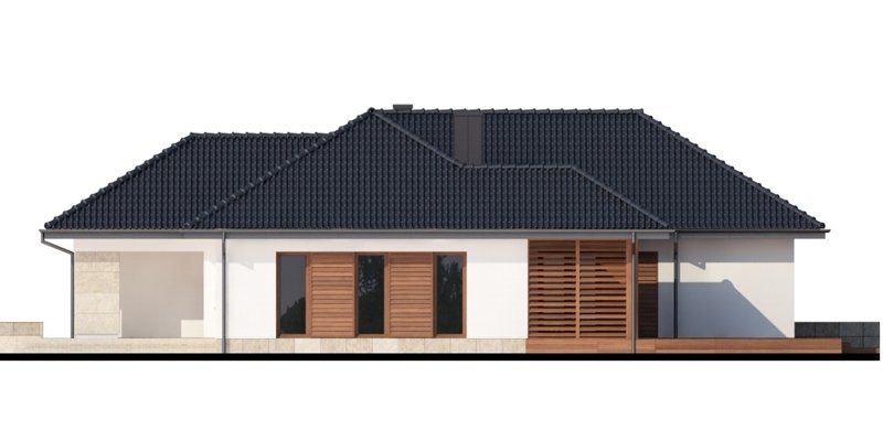 Sokrates to dom parterowy, przewidziany dla 4, 5-osobowej rodziny. Zastosowanie na elewacji tradycyjnych materiałów, takich jak drewno’ sprawia, iż jego w istocie współczesna forma zyskuje na przytulności i cieple. Doskonale także wpisuje się zarówno w krajobraz naturalny jak i już zabudowany. Wyraźnie zaznaczony jest podział na trzy strefy: dzienną, nocną oraz pomocniczą. Ma to korzystny wpływ na komfort mieszkania, jak również na prawidłowe gospodarowanie energią w domu (np. ogrzewanie), a co za tym idzie – na oszczędność. Strefa dzienna jest tak zaprojektowana, iż składające się na nią salon, jadalnia i kuchnia z praktyczną spiżarką, pomimo braku trwałych przegród, nie kolidują ze sobą, a wręcz bardzo dobrze uzupełniają się funkcjonalnie. Zwolennicy kuchni zamkniętych mogą swobodnie wydzielić ją ścianką działową. Część nocna to trzy sypialnie, przy czym każda z osobnym wyjściem na taras oraz indywidualną garderobą. Jedna z nich posiada także własną łazienkę. Garderobę naprzeciwko wejścia głównego można otworzyć bądź na sypialnię, bądź na hall główny domu. Można, usuwając ściankę działową, powiększyć powierzchnię sypialni. Jest również możliwość usytuowania w jej miejscu schodów prowadzących na strych, który po adaptacji można wykorzystać jako dodatkową sypialnię, pokój gościnny czy np. pokój hobby.