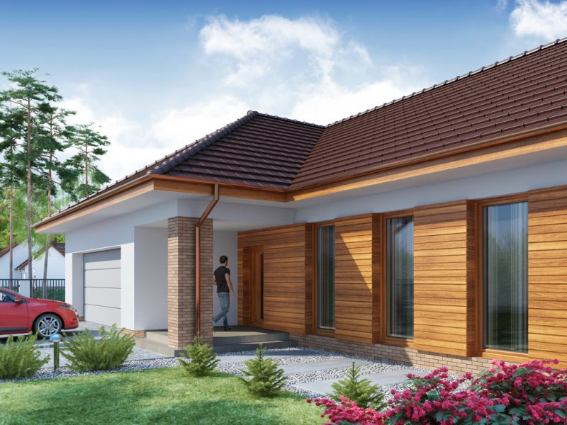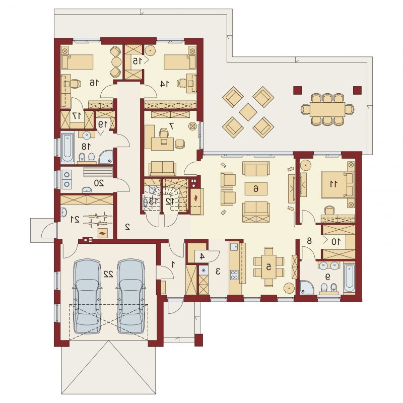 SONIA 2 PS to luksusowy dom parterowy, który zaspokoi wszelkie wymagania 4-5 osób. Przemyślne usytuowanie przedsionka zapewnia jednoczesny dostęp do garażu, części dziennej i nocnej budynku, a w razie potrzeby także poddasza zaadaptowanego na cele mieszkalne. Oddzieloną barkiem kuchnię i jadalnię oraz przestronny salon, można w razie potrzeby wydzielić jako osobne pomieszczenia ze względu na ich doskonałe doświetlenie. Ekskluzywne rozwiązanie w postaci wydzielenia strefy głównej sypialni z własną łazienką i garderobą, zapewnia bezpośredni dostęp do części dziennej oraz zadaszonego tarasu. Przy przejściu do zacisznej części nocnej znajduje się toaleta i podręczne schowki, za którymi znajdują się dwie obszerne sypialnie z własnymi garderobami oraz łazienka z wydzielonym pomieszczeniem pomocniczym i pralnia. Przestronny gabinet może z powodzeniem pełnić rolę pokoju gościnnego lub kolejnej sypialni. Układ funkcjonalny dopełnia duży, wygodny garaż z przejściem do obszernego pomieszczenia gospodarczego, wyposażonego w praktyczne wyjście do ogrodu.