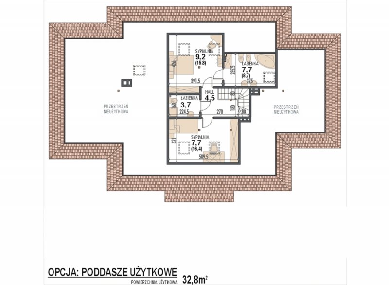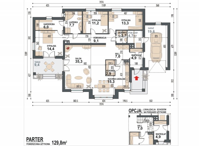 * jednorodzinny dom parterowy z poddaszem nieużytkowym możliwym do zaaranżowania i garażem jednostanowiskowym (istnieje wersja dwustanowiskowa), niepodpiwniczony
