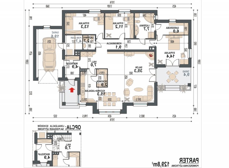 * na parterze zaprojektowano przestronny salon z kominkiem, kuchnię z aneksem jadalnym i spiżarnią, dwie łazienki, 3 sypialnie, garderobę połączoną z łazienką, przedsionek, hall, kotłownię (pomieszczenie gospodarcze) oraz garaż;