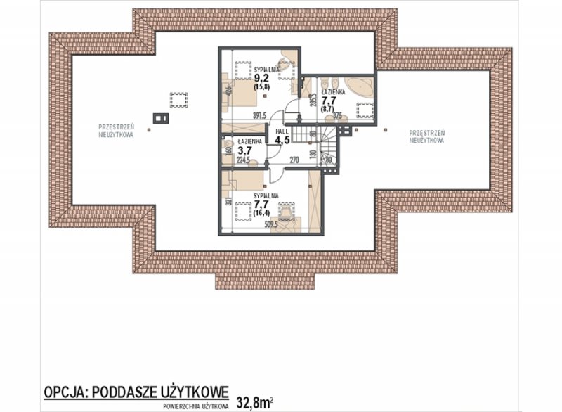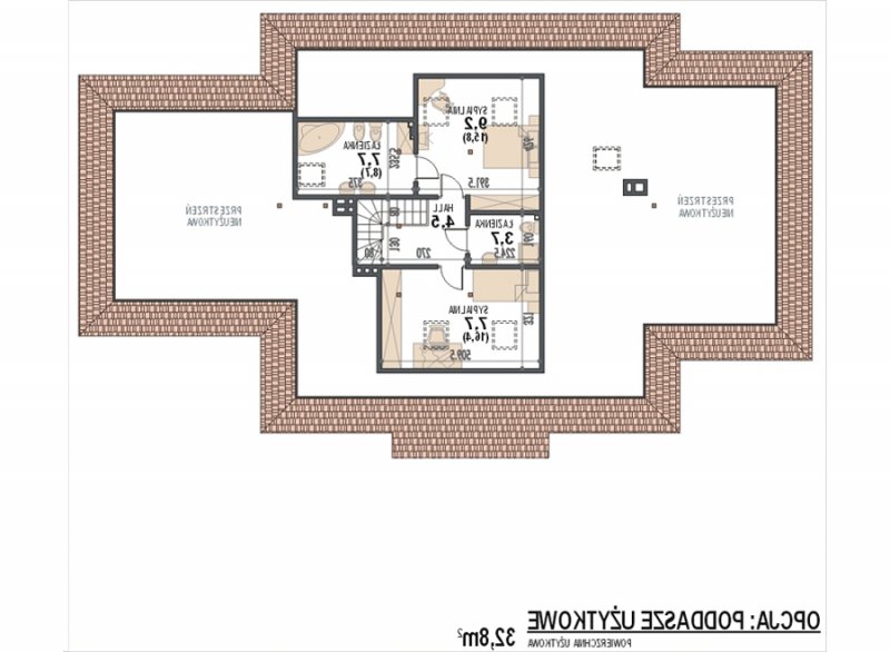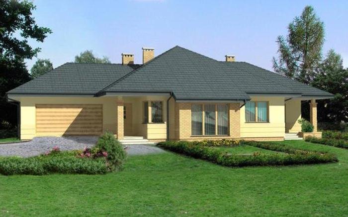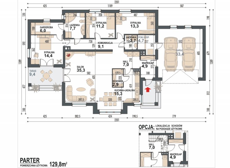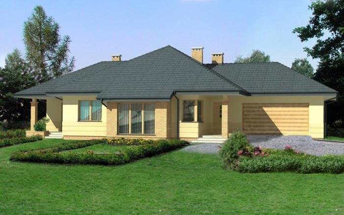 * jednorodzinny dom parterowy z poddaszem nieużytkowym możliwym do zaaranżowania i garażem dwustanowiskowym (istnieje wersja jednostanowiskowa), niepodpiwniczony