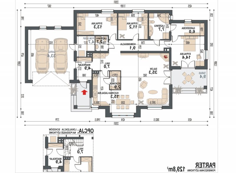 * na parterze zaprojektowano przestronny salon z kominkiem, kuchnię z aneksem jadalnym i spiżarnią, dwie łazienki, 3 sypialnie, garderobę połączoną z łazienką, przedsionek, hall, kotłownię (pomieszczenie gospodarcze) oraz garaż;