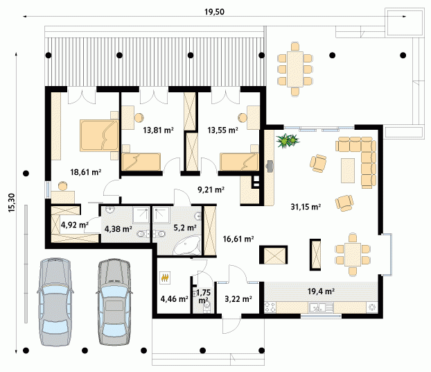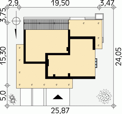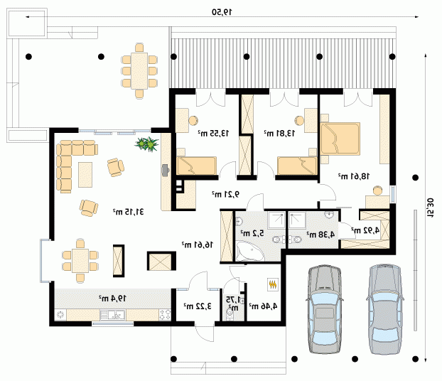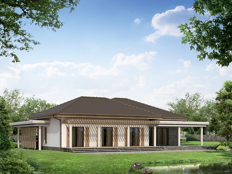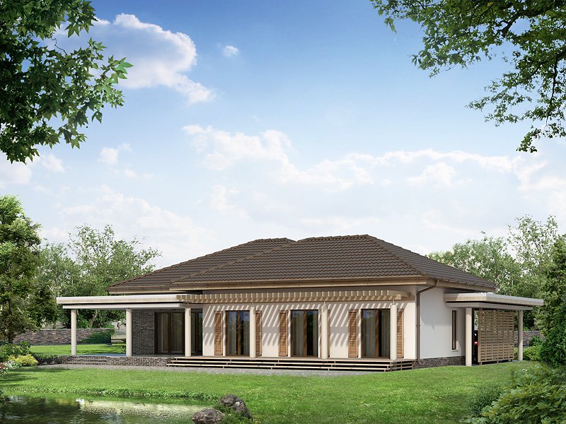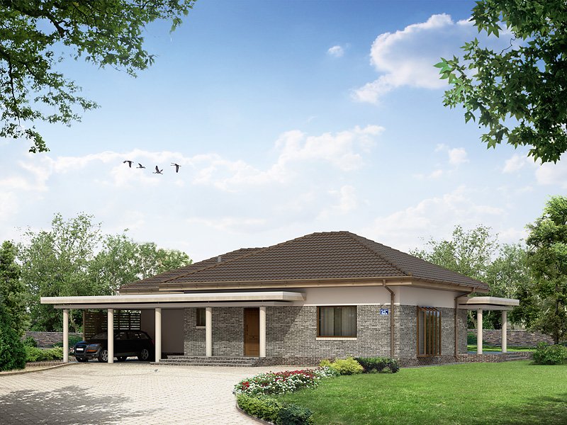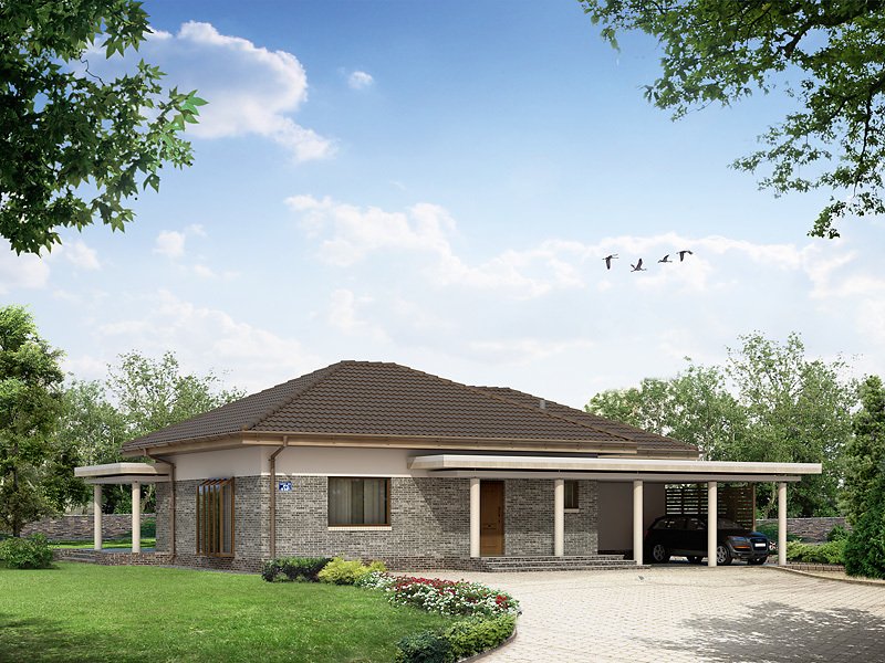 Dom mieszkalny jednorodzinny przeznaczony dla 4-osobowej rodziny. Zaprojektowano czytelny, funkcjonalny układ parteru. Wyraźnie oddzielona część nocna od części dziennej z osobną łazienką dla rodziców. Istnieje możliwość zabudowania wiaty garażowej.