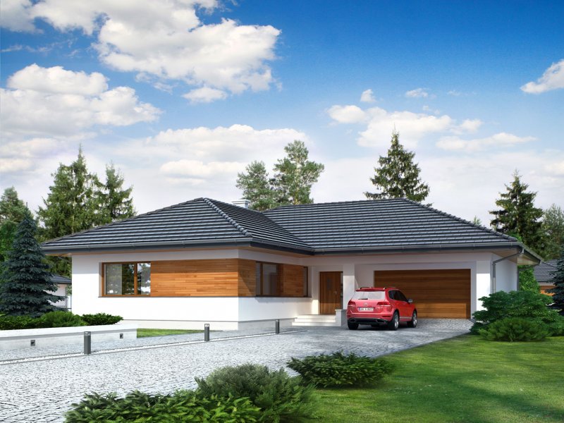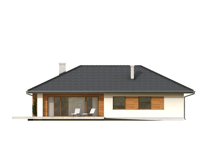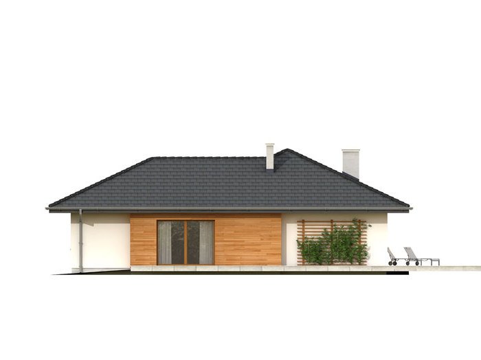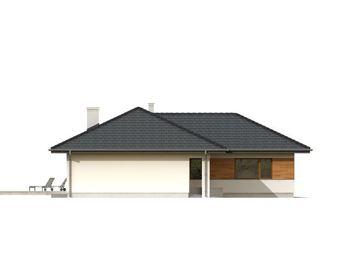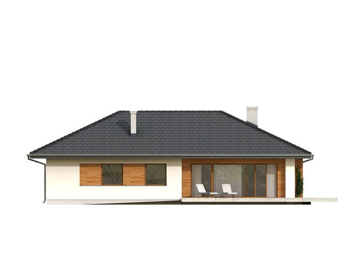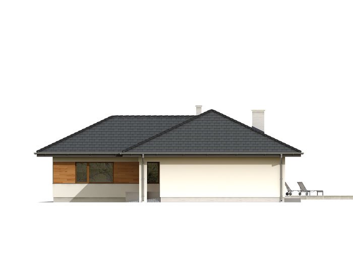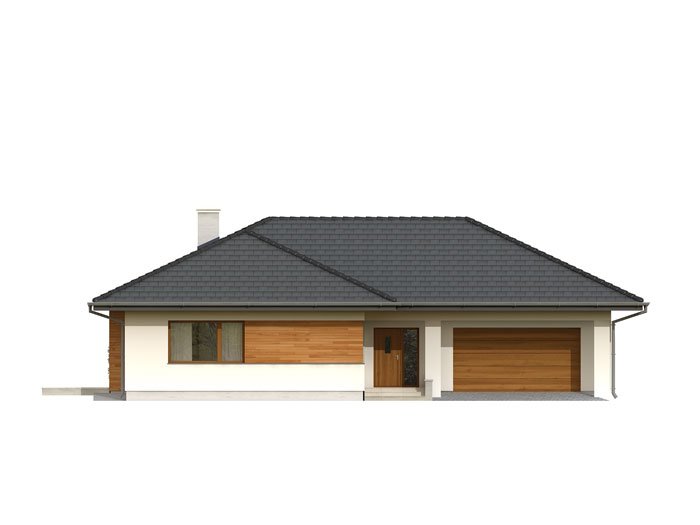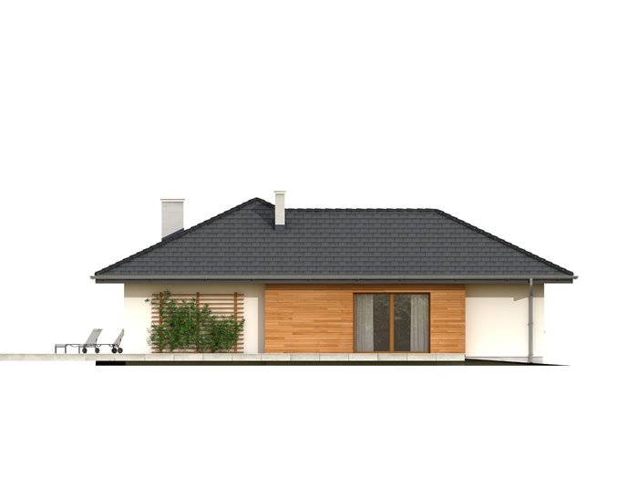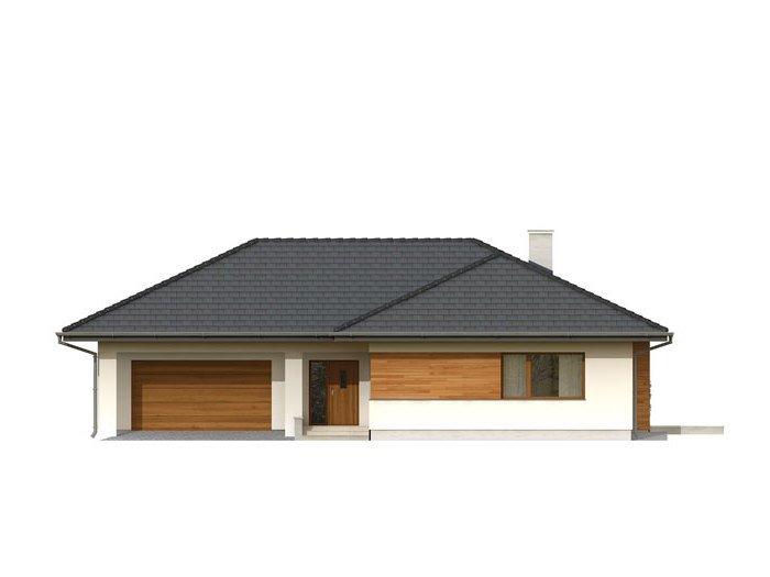 Parterowy dom jednorodzinny, niepodpiwniczony z dwustanowiskowym garażem. Ten wygodny dom, swoim pełnym programem funkcjonalnym zapewnia komfort 4-osobowej rodzinie. Przestronna część dzienne to salon połączony z jadalnią, otwierający się na ogród poprzez ogromne przeszklenie oraz otwarta kuchnia wraz z półwyspem i ze spiżarnią. Tak zaproponowany, ciekawy i przestronny układ pomieszczeń umożliwia dowolność i szereg aranżacji. Część nocna to 3 wygodne sypialnie, z czego największa posiada garderobę oraz łazienka, gdzie przewidziano miejsce na pralkę. W domu zaprojektowano dużą kotłownię dostępną z garażu, której parametry pozwalają na montaż kotła na każdy rodzaj paliwa, w tym na paliwo stałe. Sam garaż, którego wielkość przekracza parametry standardowego garażu jednostanowiskowego, umożliwia umieszczenie tam np. kosiarki. Ten optymalny i ciekawy program funkcjonalny został ujęty w prostej bryle na rzucie litery L, przykrytej wielospadowym dachem. Atutem projektu jest jego prostota zarówno w układzie pomieszczeń jak i w rozwiązaniach elewacji, gdzie elegancki, nowoczesny styl osiągnięto poprzez klasyczne, proste ale szlachetne materiały takie jak szalówka oraz delikatny, subtelny detal.