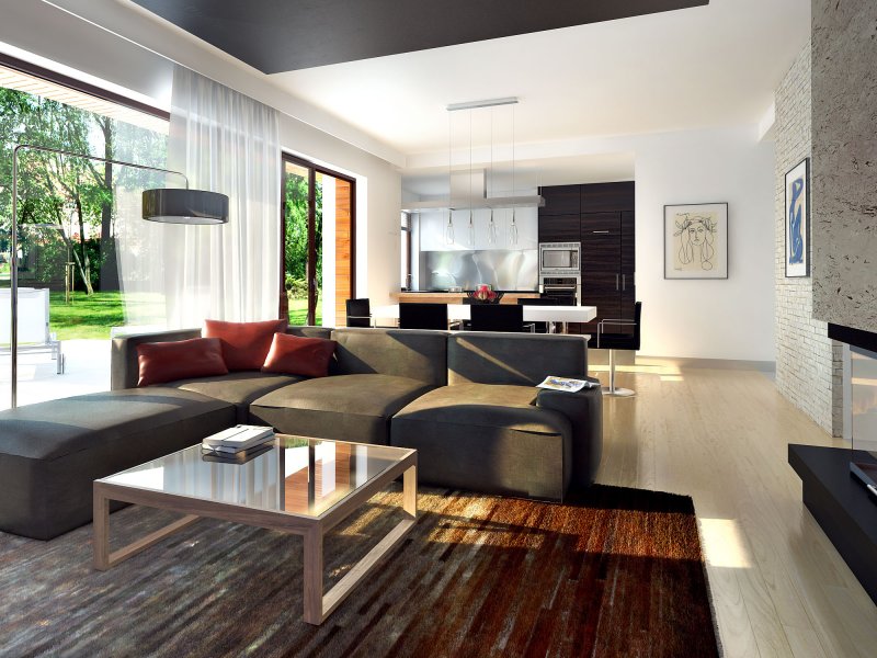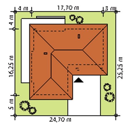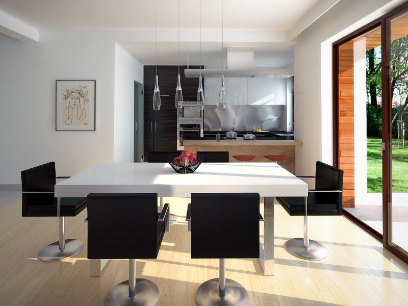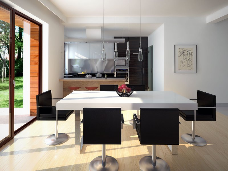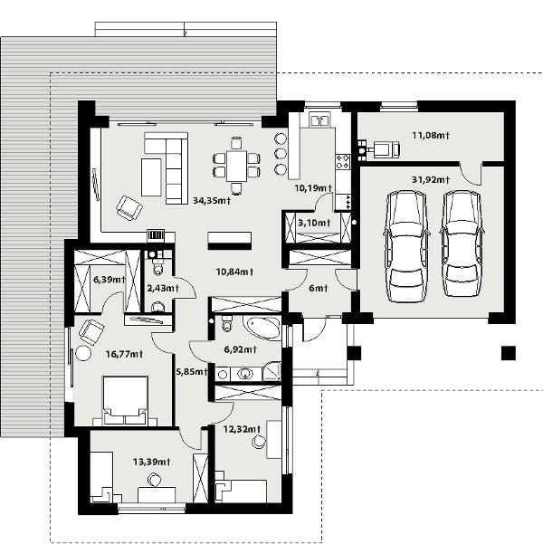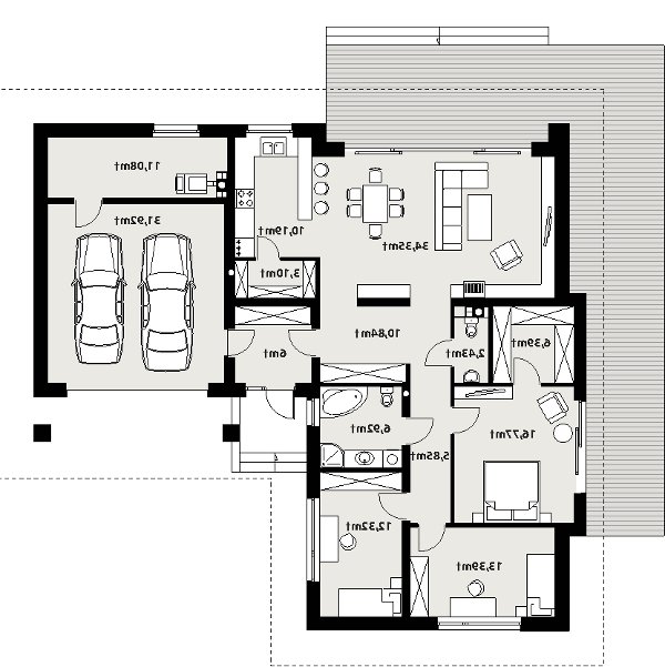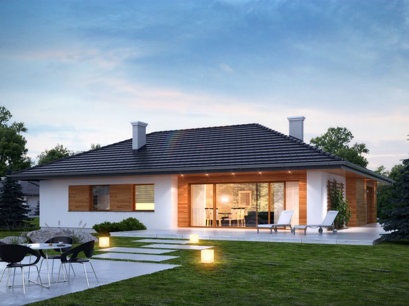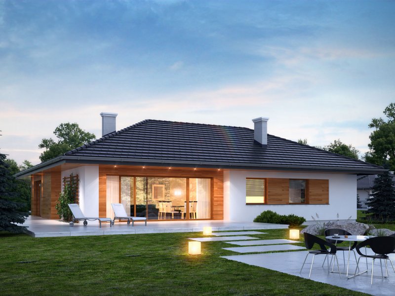 Parterowy dom jednorodzinny, niepodpiwniczony z dwustanowiskowym garażem. Ten wygodny dom, swoim pełnym programem funkcjonalnym zapewnia komfort 4-osobowej rodzinie. Przestronna część dzienne to salon połączony z jadalnią, otwierający się na ogród poprzez ogromne przeszklenie oraz otwarta kuchnia wraz z półwyspem i ze spiżarnią. Tak zaproponowany, ciekawy i przestronny układ pomieszczeń umożliwia dowolność i szereg aranżacji. Część nocna to 3 wygodne sypialnie, z czego największa posiada garderobę oraz łazienka, gdzie przewidziano miejsce na pralkę. W domu zaprojektowano dużą kotłownię dostępną z garażu, której parametry pozwalają na montaż kotła na każdy rodzaj paliwa, w tym na paliwo stałe. Sam garaż, którego wielkość przekracza parametry standardowego garażu jednostanowiskowego, umożliwia umieszczenie tam np. kosiarki. Ten optymalny i ciekawy program funkcjonalny został ujęty w prostej bryle na rzucie litery L, przykrytej wielospadowym dachem. Atutem projektu jest jego prostota zarówno w układzie pomieszczeń jak i w rozwiązaniach elewacji, gdzie elegancki, nowoczesny styl osiągnięto poprzez klasyczne, proste ale szlachetne materiały takie jak szalówka oraz delikatny, subtelny detal.