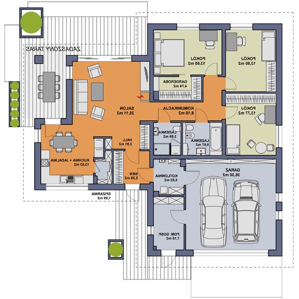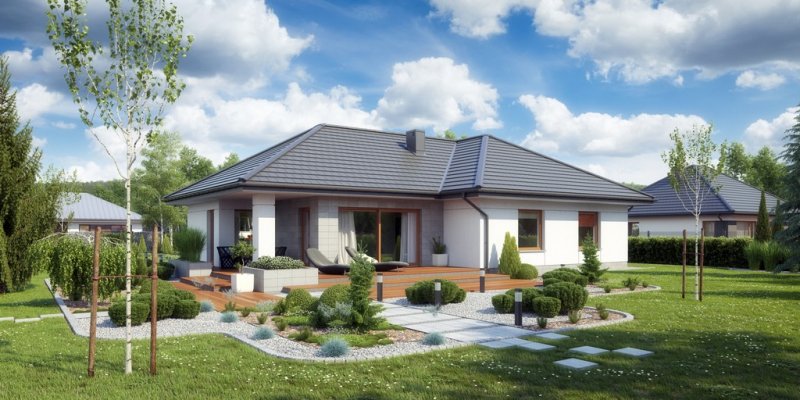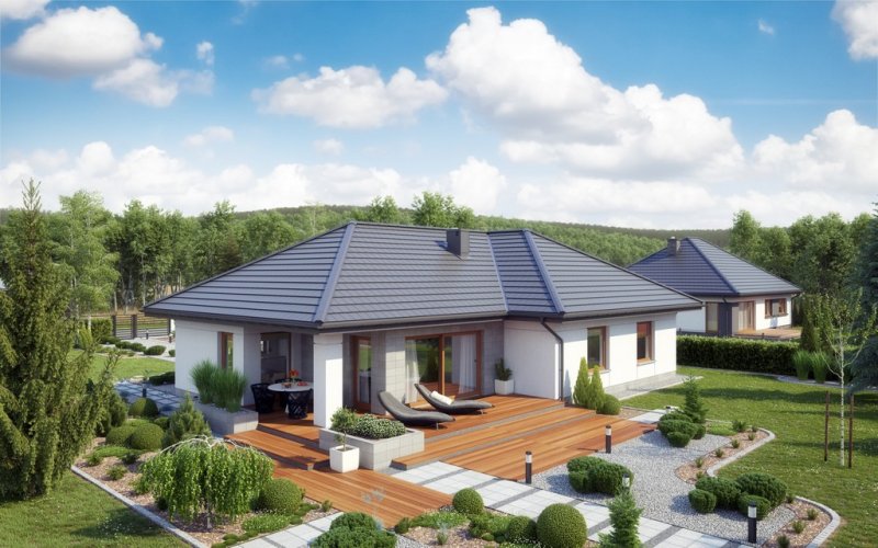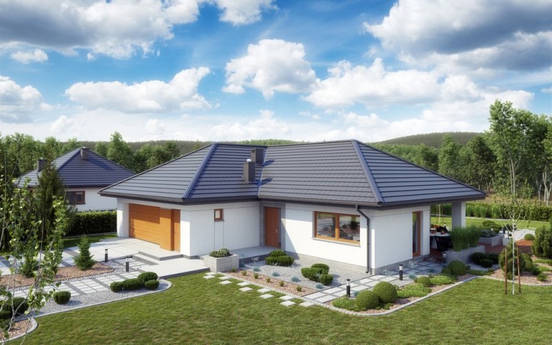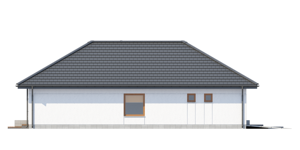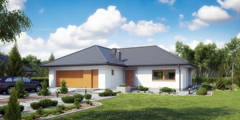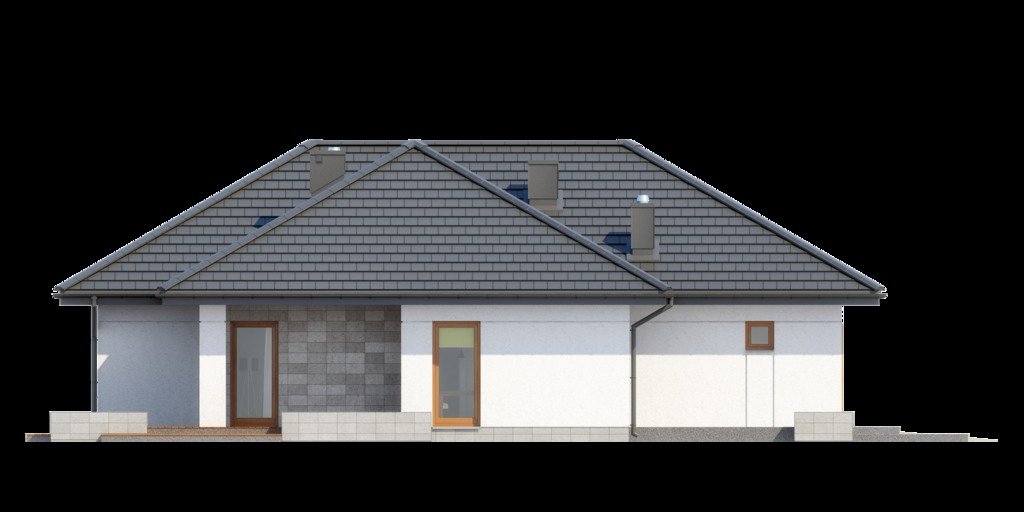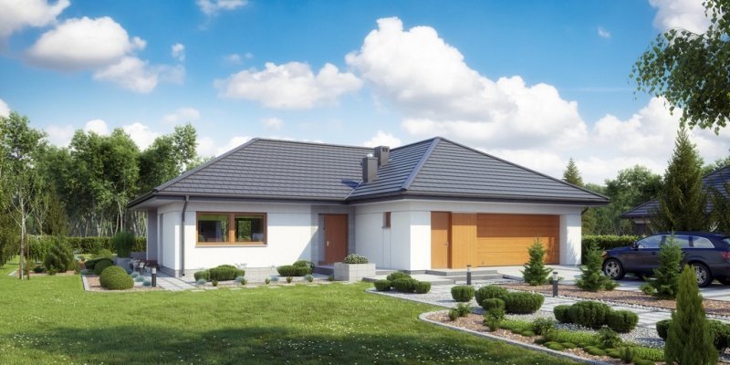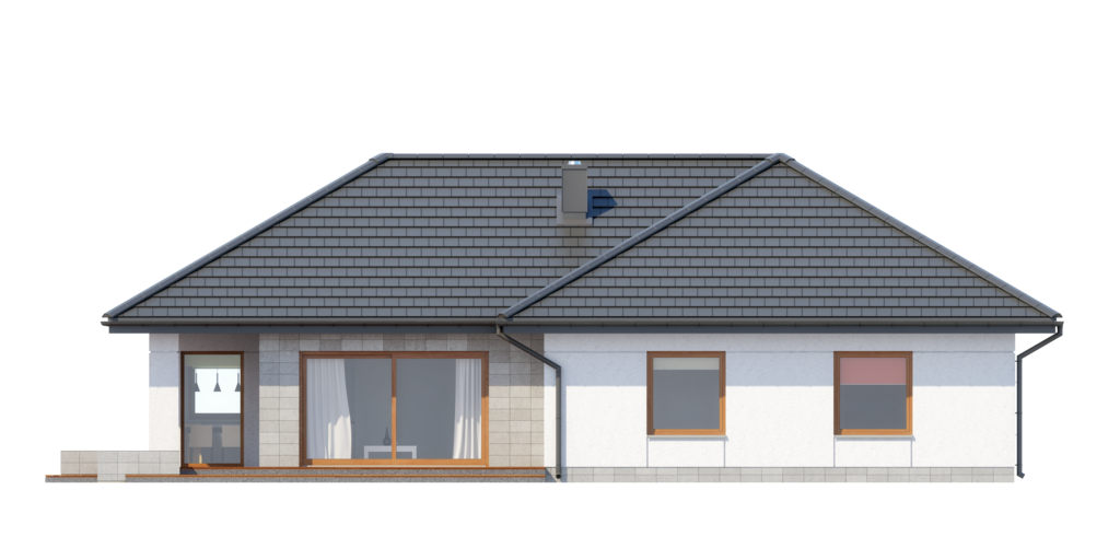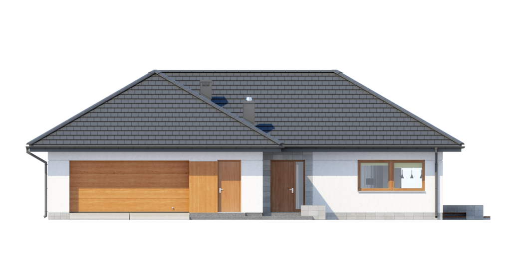 Bardzo wygodny dom dla czteroosobowej rodziny. Spodoba się on osobom ceniącym oprócz walorów wizualnych również funkcjonalność pomieszczeń. Dzięki rozbudowanej strefie gospodarczej przy garażu na pewno nie zabraknie tu miejsca na narty, sanki czy rowery. Również przy kuchni pomyślano o małej spiżarce, która przyda się niejednej pani domu. Dom posiada trzy wygodne sypialnie przy czym jedną połączona z garderobą.