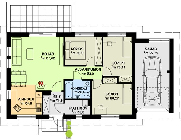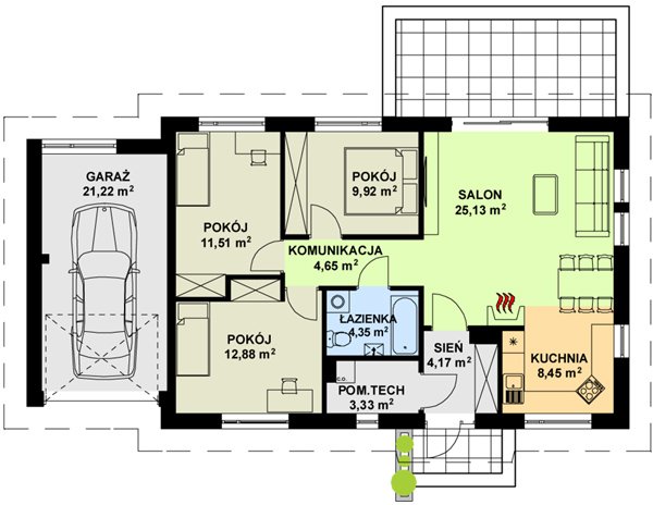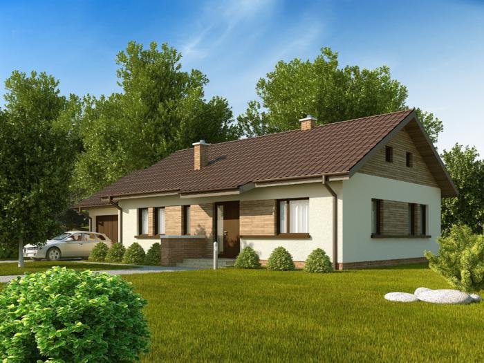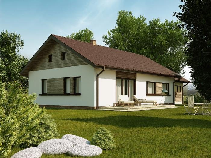 Prosty, ekonomiczny w budowie i późniejszej eksploatacji dom parterowy. Dom posiada 3 sypialnie sprawdzi się więc doskonale dla rodziny 4 osobowej. W wersji podstawowej kuchnia połączona została z salonem poprzez jadalnię, jednak dla osób nie lubiących takiego rozwiązania istnieje możliwość zamknięcia kuchni.