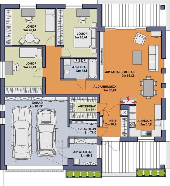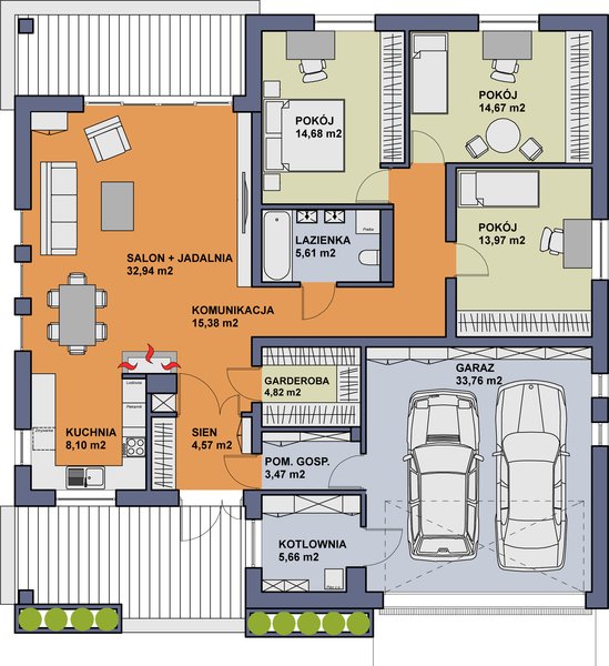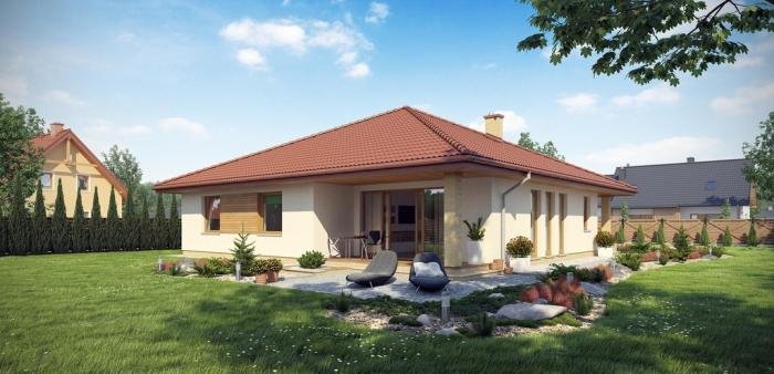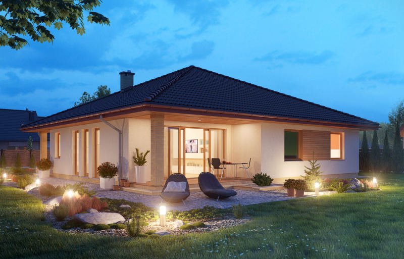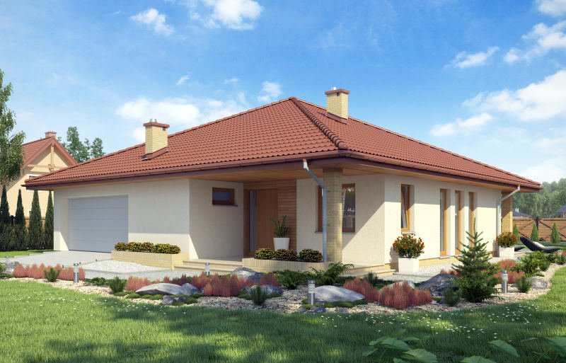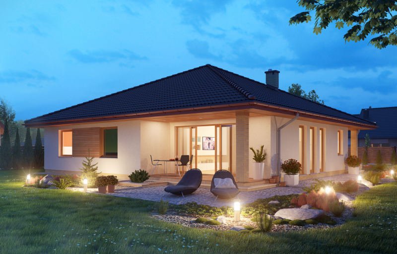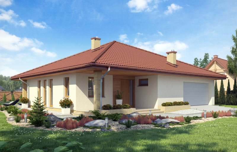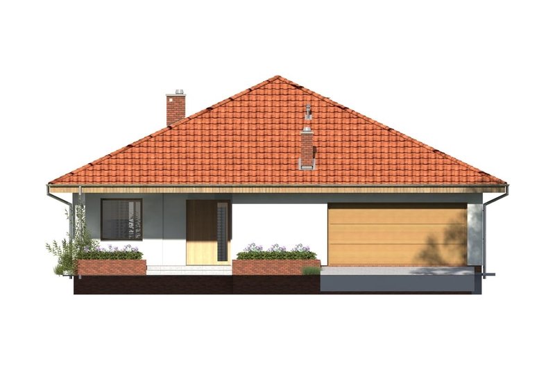 Niezwykle funkcjonalny dom parterowy, który pomimo niewielkich gabarytów doskonale sprawdzi się w użytkowaniu przez czteroosobową rodzinę. Dom posiada trzy sypialnie, łazienkę, salon z jadalnią, kuchnię oraz dwustanowiskowy garaż. Nie zabrakło tu również pomieszczeń dodatkowych, które ułatwiają codzienne życie, takich jak wygodna garderoba, pomieszczenie gospodarcze i powiększona kotłownia, która może pełnić funkcję składziku przy garażu.