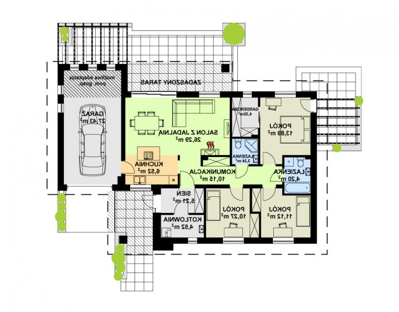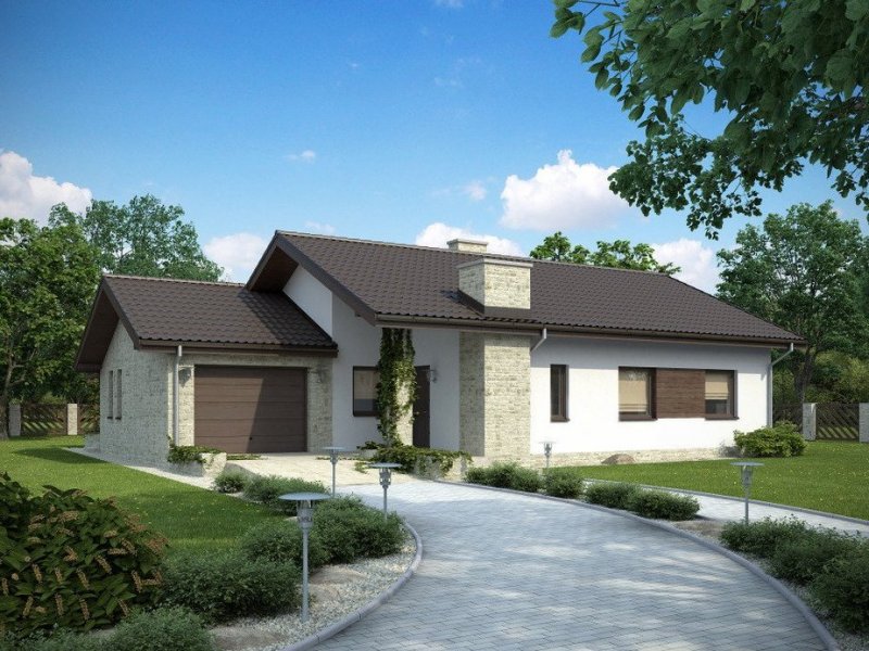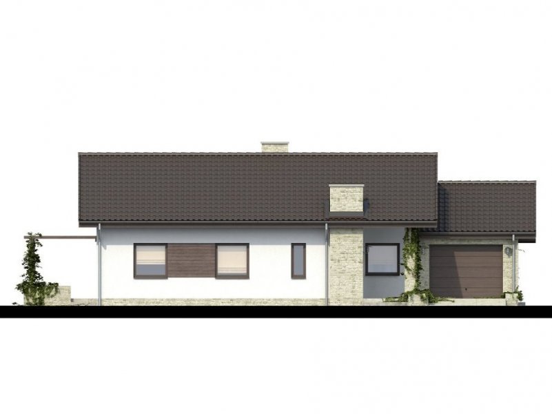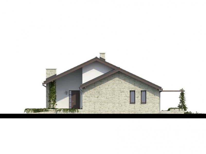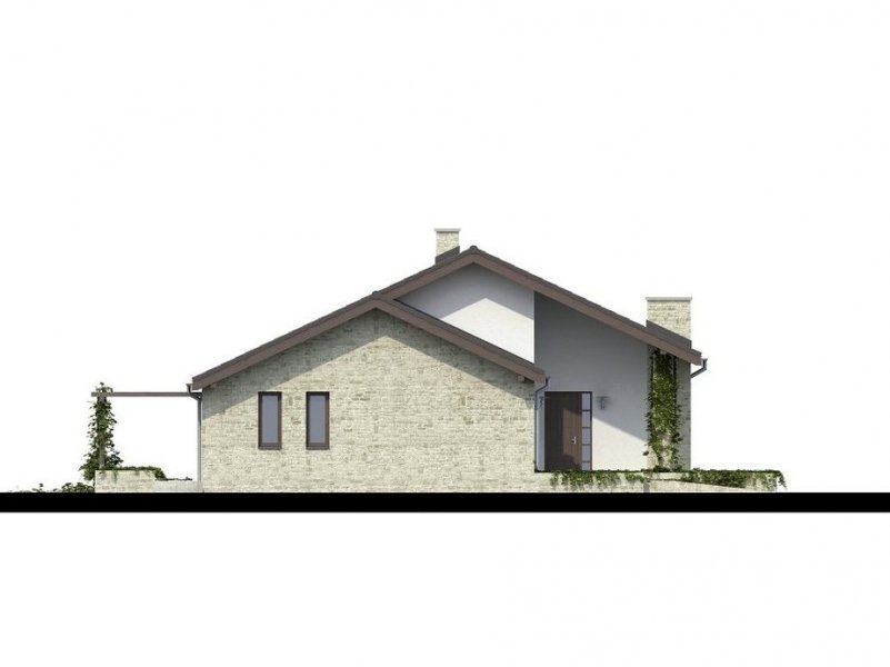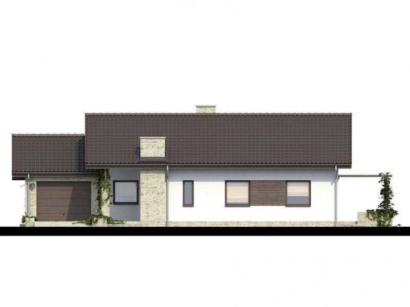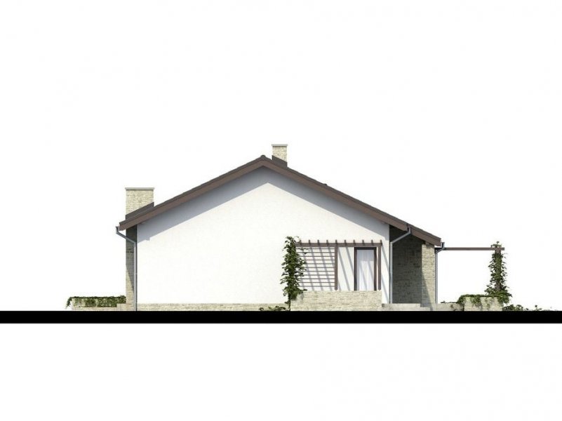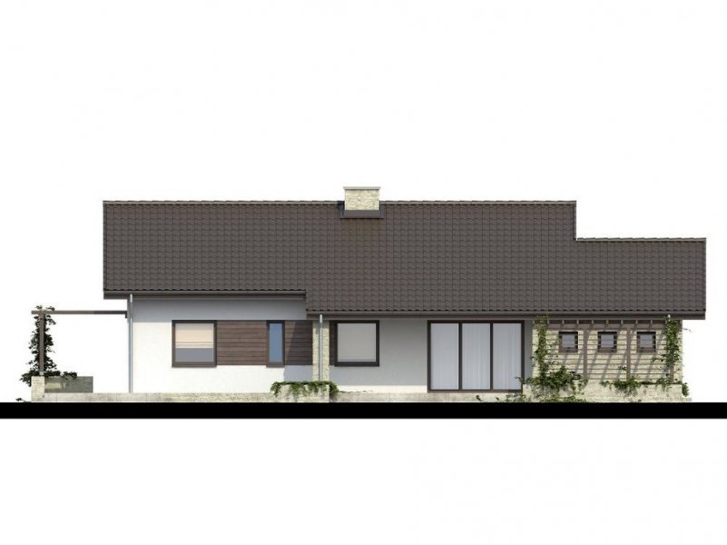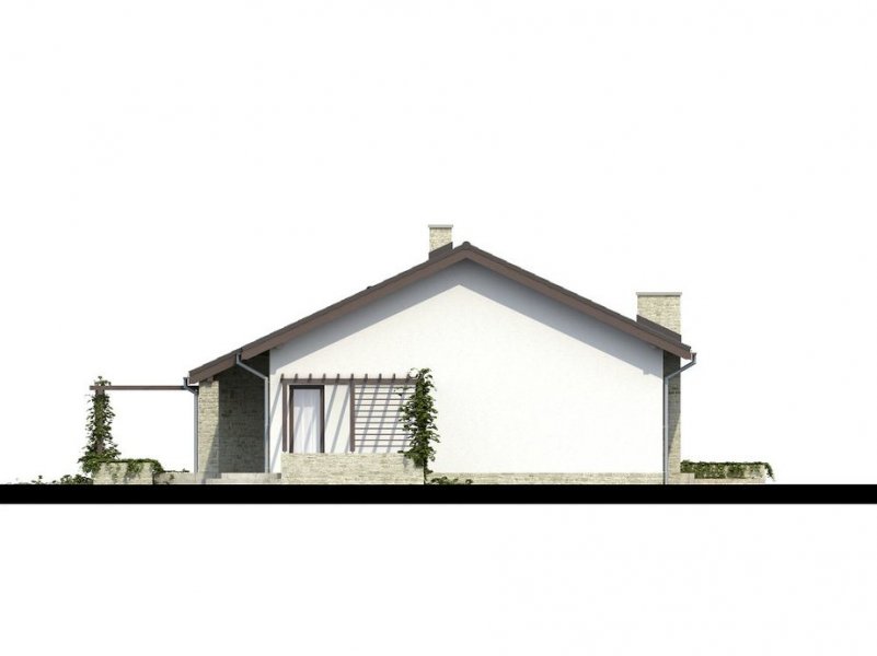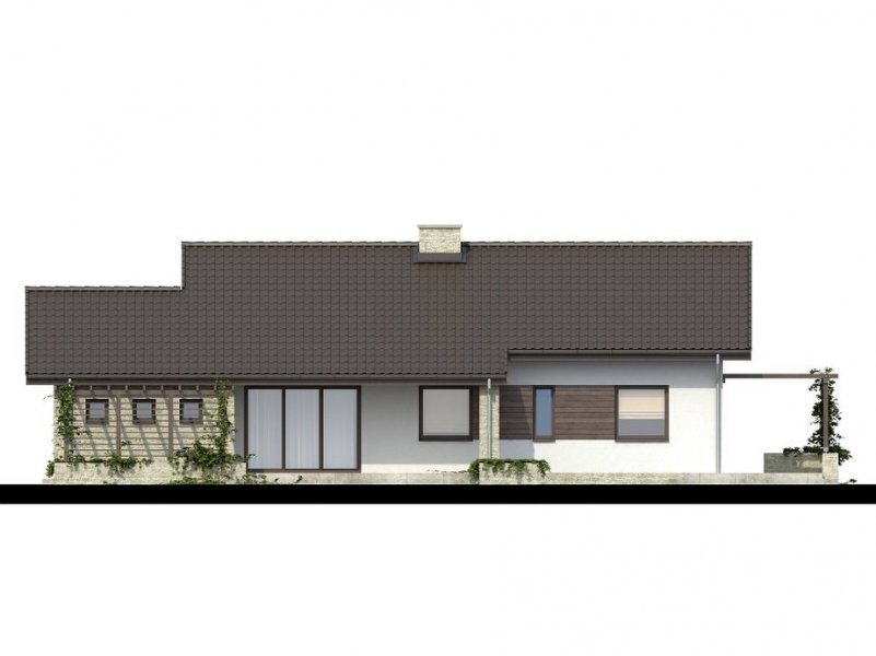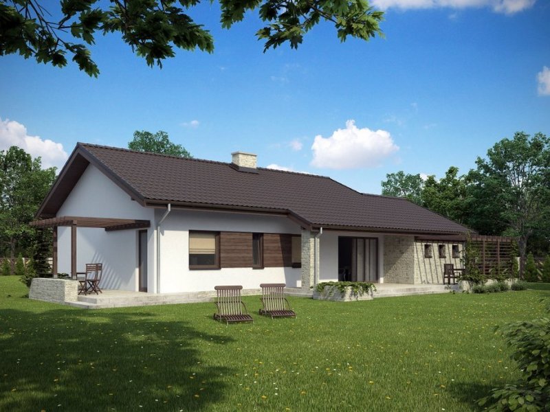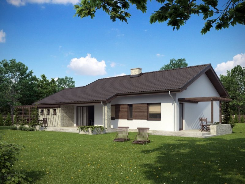 Parterowy dom jednorodzinny o nowoczesnym wyglądzie. Budynek charakteryzuje się bardzo prostą bryłą będzie więc niedrogi w wykonaniu i późniejszej eksploatacji. Pomimo tej prostej bryły, z zewnątrz budynek wygląda lekko i niebanalnie dzięki zastosowaniu tarasów, murków i pergoli, które dodają mu uroku. Niewątpliwą zaletą domu jest także zadaszenie części tarasu, dzięki czemu możemy z niego korzystać bez względu na pogodę.