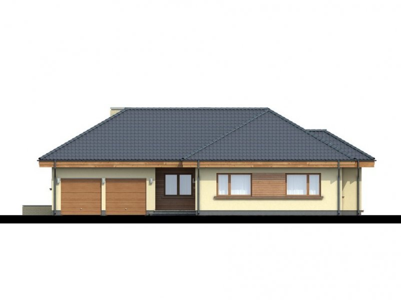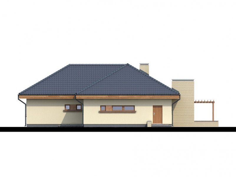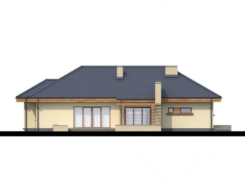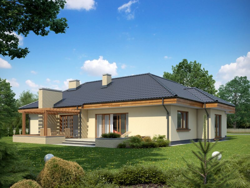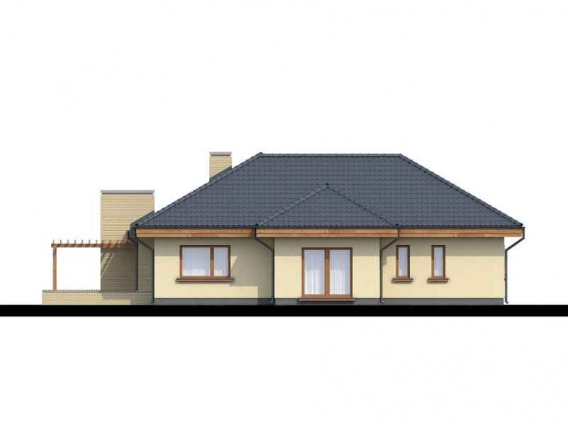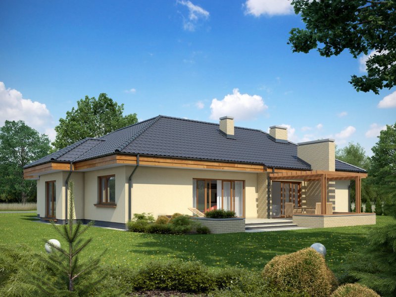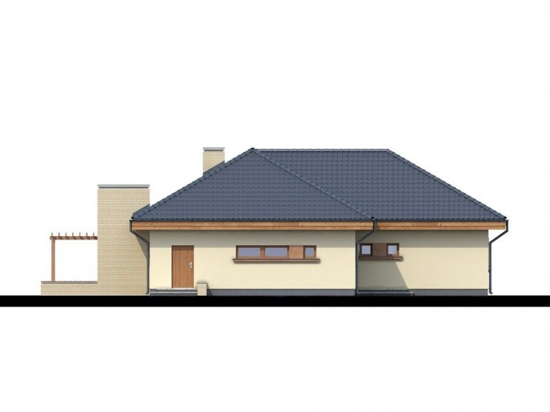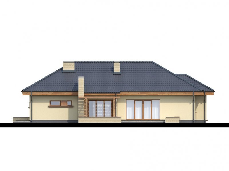 Rozłożysty dom parterowy na planie litery L z ciekawie rozwiązaną strefą wejściową. Drzwi wejściowe ukryte z boku oraz odgrodzenie murkiem z zielenią dają mieszkańcom poczucie bezpieczeństwa i intymności. Dom niezwykle funkcjonalny dzięki licznym pomieszczeniom pomocniczym takim jak spiżarnia czy garderoby. We wnętrzu wyraźny podział na strefę dzienną i nocna. W strefie nocnej trzy duże sypialnie oraz dodatkowy pokój przy salonie np. na gabinet.