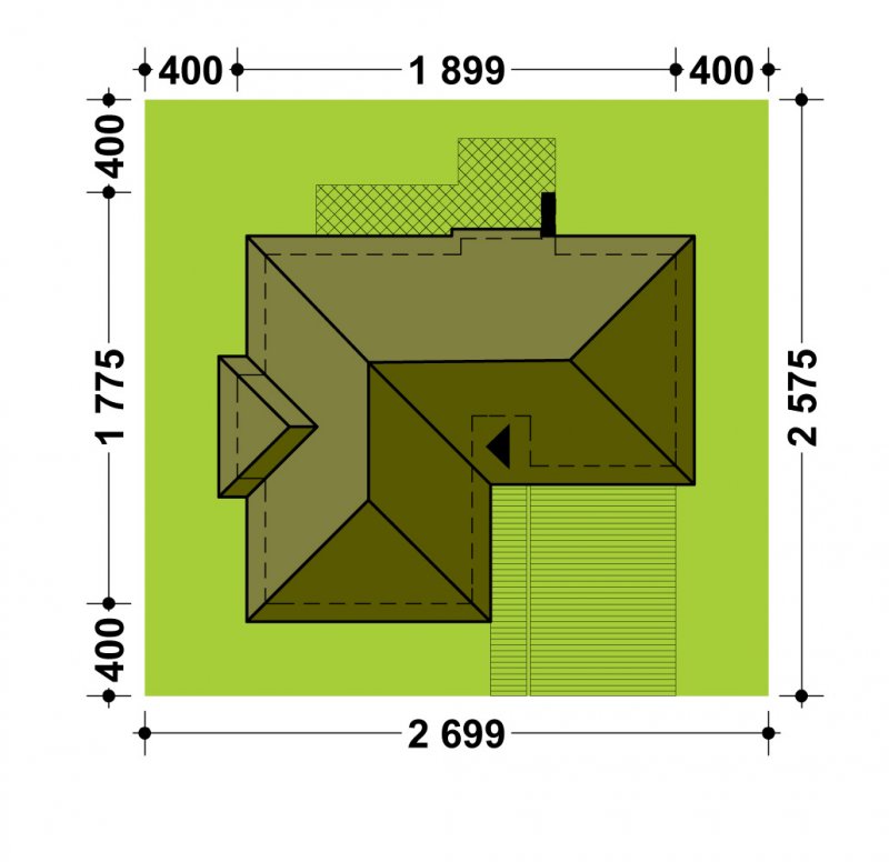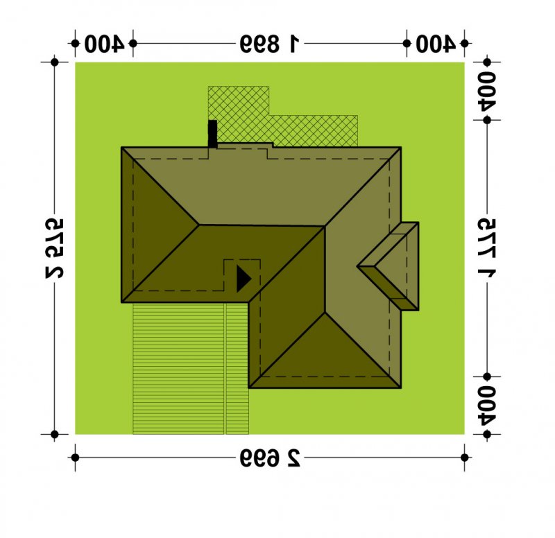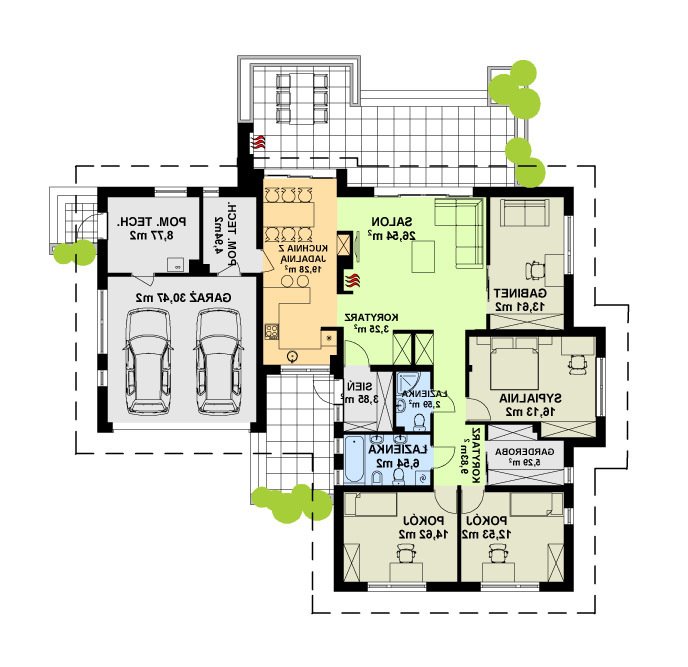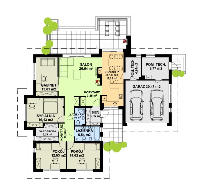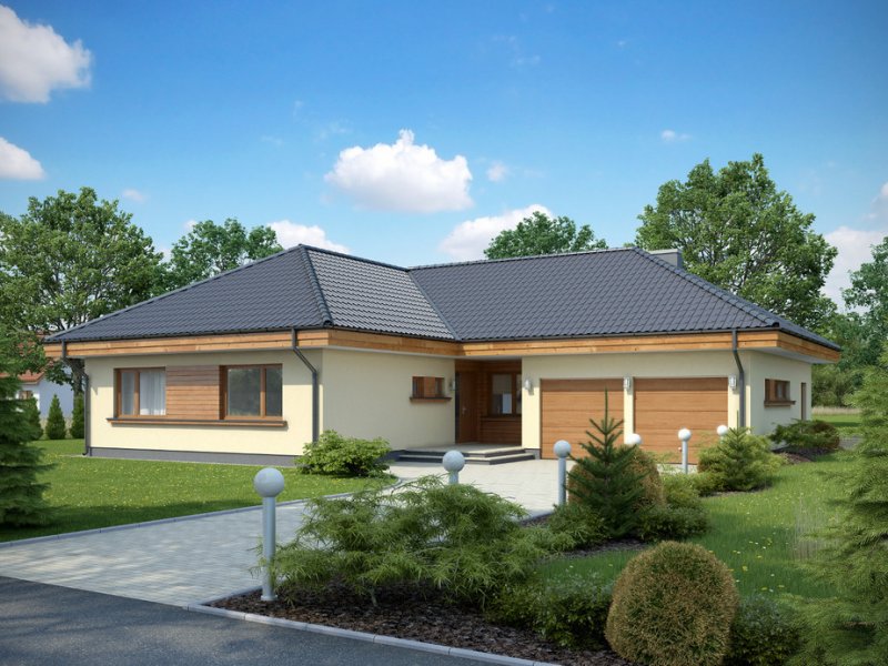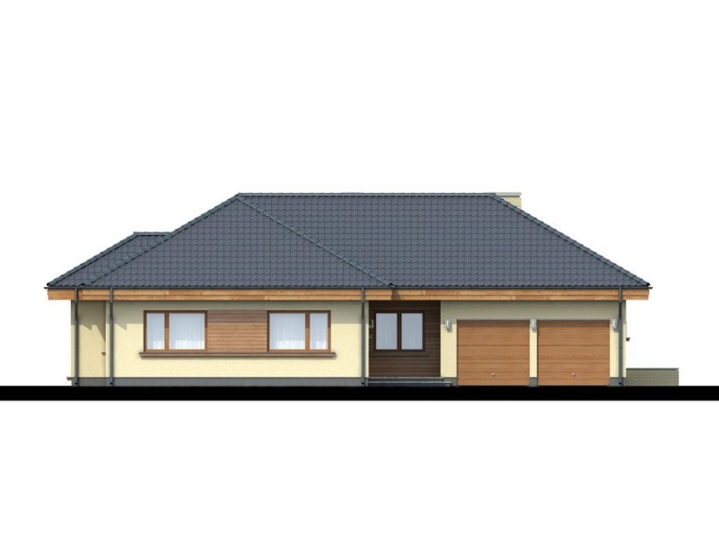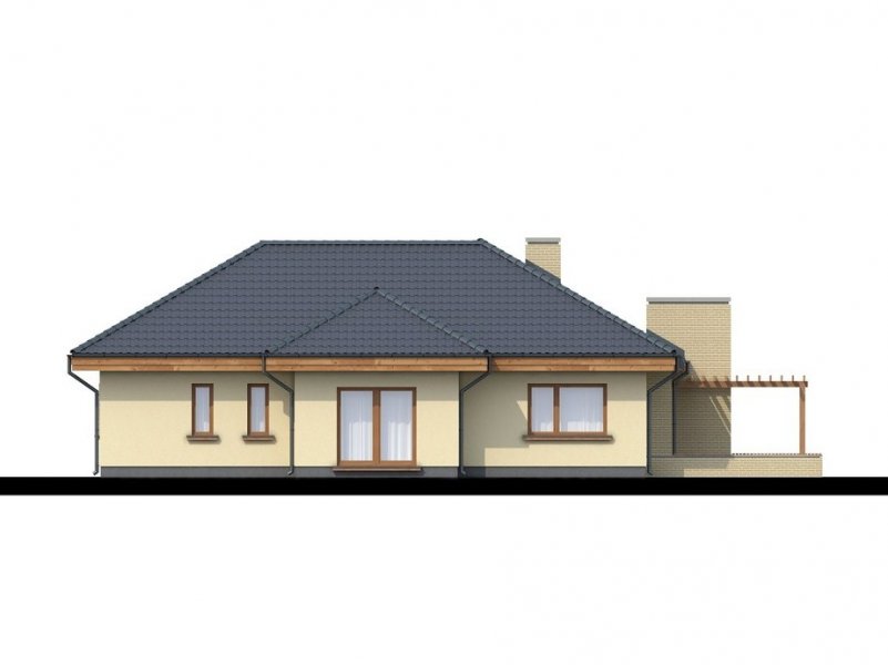 Rozłożysty dom parterowy na planie litery L z ciekawie rozwiązaną strefą wejściową. Drzwi wejściowe ukryte z boku oraz odgrodzenie murkiem z zielenią dają mieszkańcom poczucie bezpieczeństwa i intymności. Dom niezwykle funkcjonalny dzięki licznym pomieszczeniom pomocniczym takim jak spiżarnia czy garderoby. We wnętrzu wyraźny podział na strefę dzienną i nocna. W strefie nocnej trzy duże sypialnie oraz dodatkowy pokój przy salonie np. na gabinet.