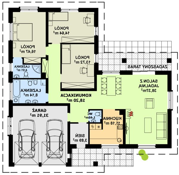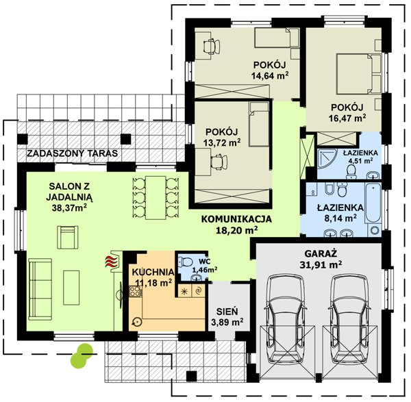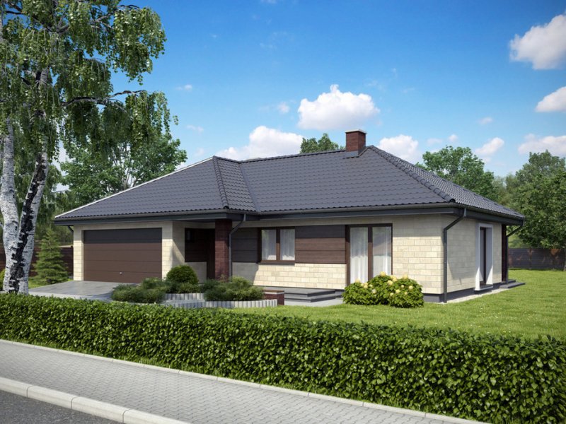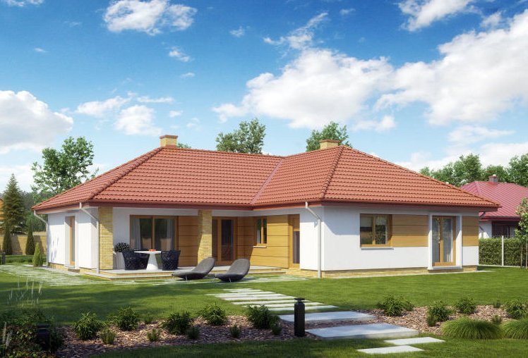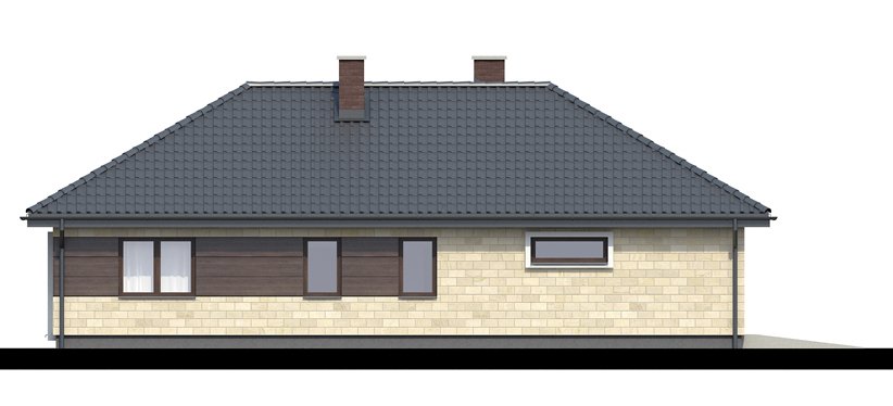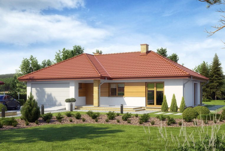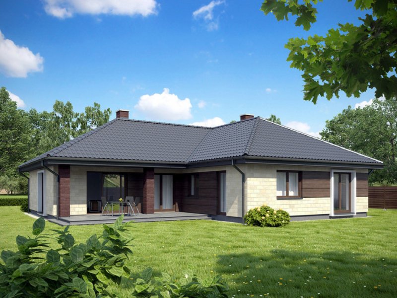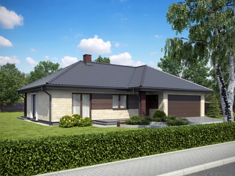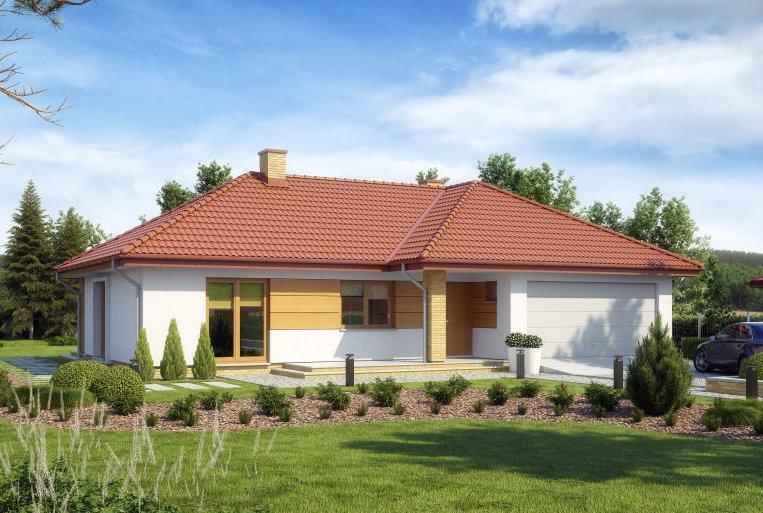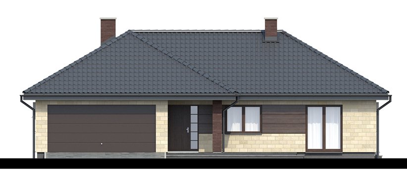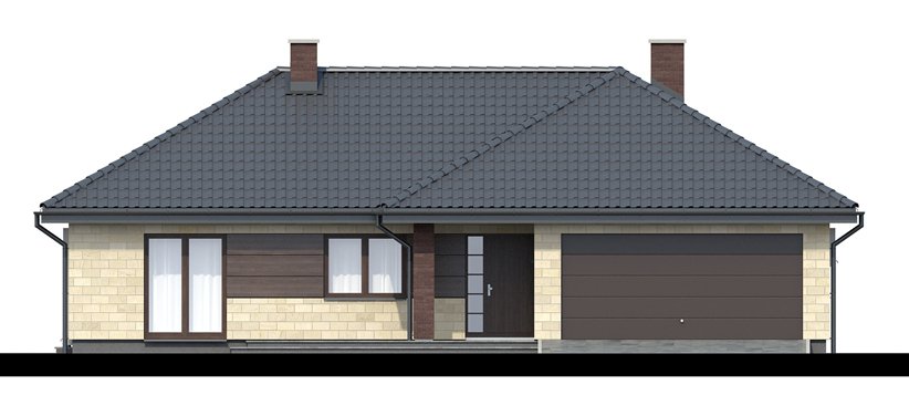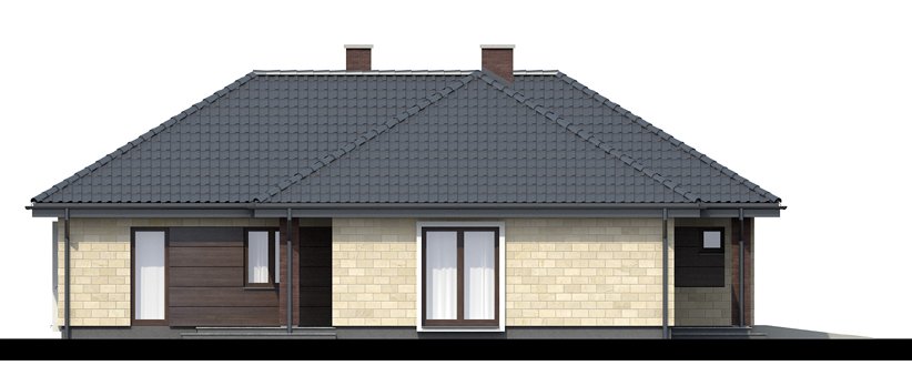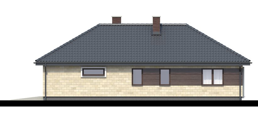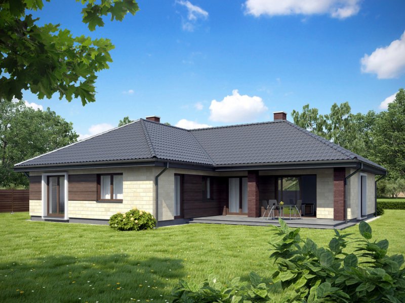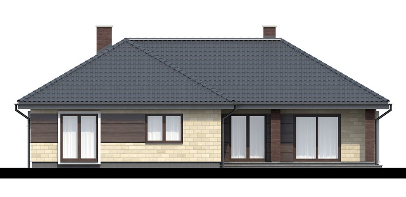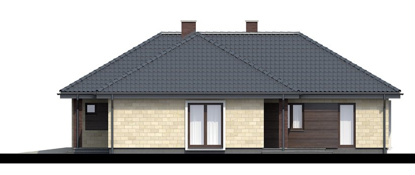 Rozłożysty dom parterowy o nowoczesnym wyglądzie doskonale sprawdzi się dla rodziny czteroosobowej. Dom posiada trzy sypialnie oraz duży pokój połączony z jadalnią. Kuchnia jest częściowo otwarta na jadalnię, z możliwością zamknięcia. Niewątpliwą zaletą domu jest duży zadaszony taras od strony ogrodu.
