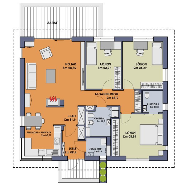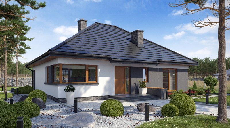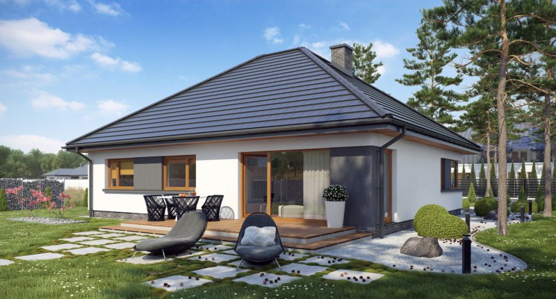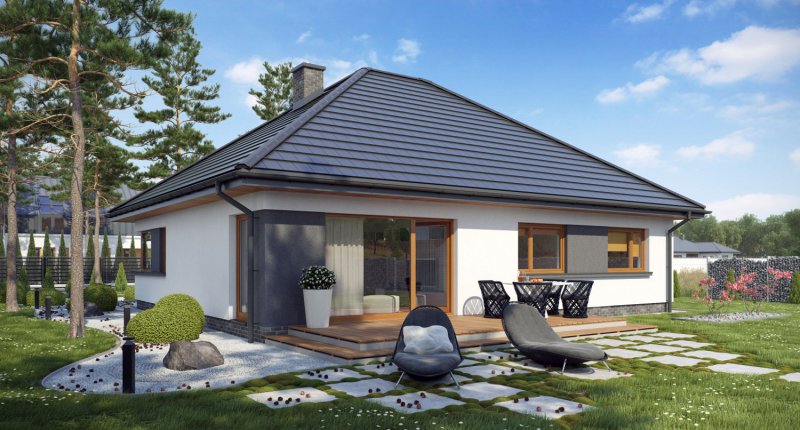 TK34 to dom parterowy przeznaczony dla rodziny 4-osobowej. Prosta bryła w połączeniu z nowoczesnymi detalami nadaje budynkowi bardzo interesującego wyglądu. Wygodnym rozwiązaniem jest połączenie kuchni z jadalnią, przez co dom wydaje się przestronniejszy. Mimo swej niedużej wielkości posiada trzy funkcjonalne sypialnie i dwie łazienki, z których do jednej znajduje się wejście bezpośrednio z największej sypialni. Kominek usytuowany w centralnej części stanowi doskonałe dopełnienie całości.