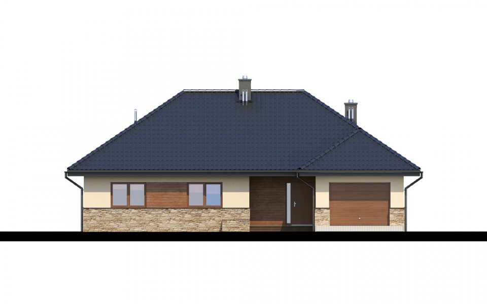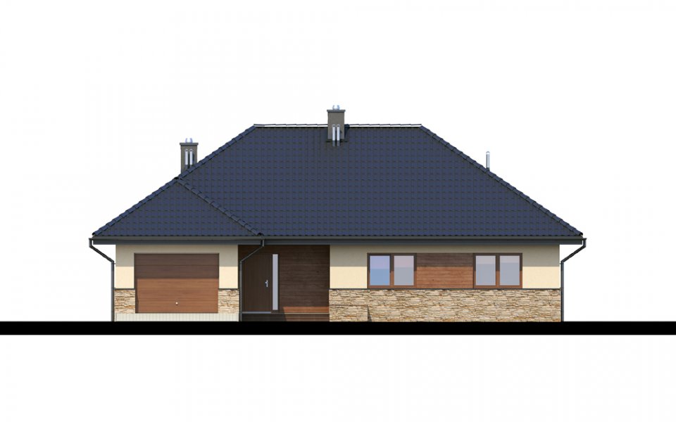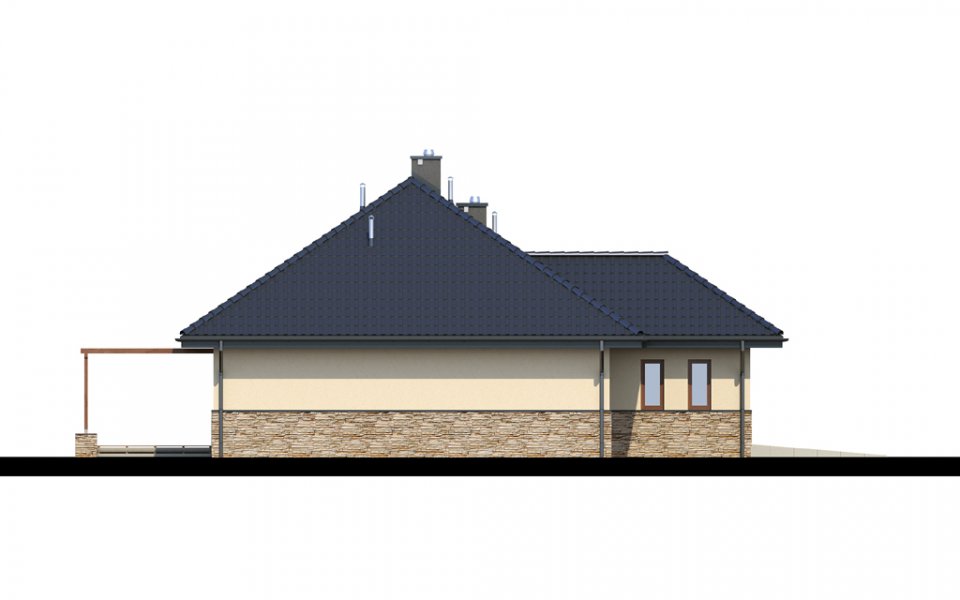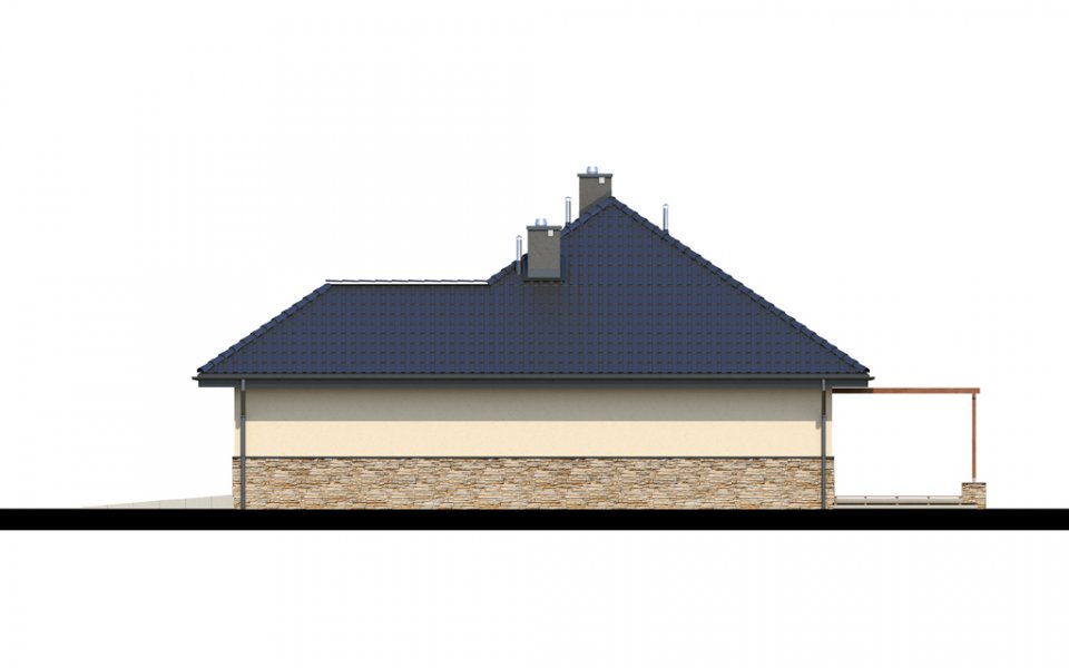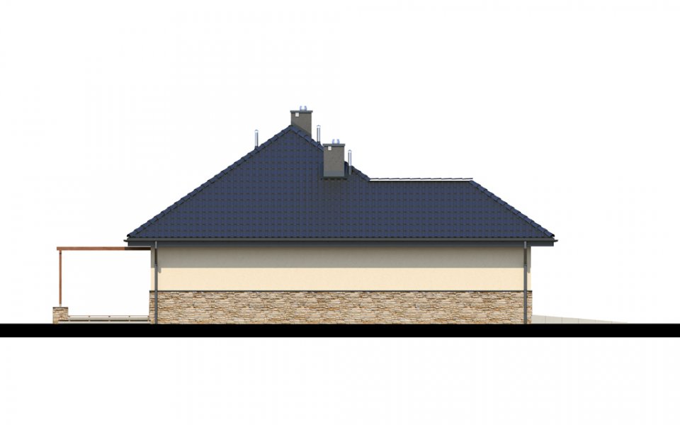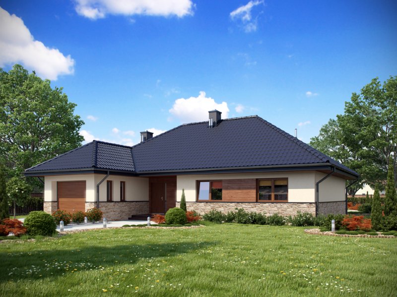 Parterowy dom o racjonalnie rozplanowanym wnętrzu. Wyposażony jest we wszystko, czego potrzebuje czteroosobowa rodzina- trzy pokoje, łazienkę, dodatkowe WC, garderobę oraz przestronny salon otwarty na kuchnię i jadalnię. Dodatkowo w domu znajduje się kotłownia i jednostanowiskowy garaż. Jest to dom o tradycyjnej bryle a elementy zieleni na pergolach oraz naturalne materiały na elewacji sprawiają, że wpasuje się on idealnie w każdy krajobraz.
