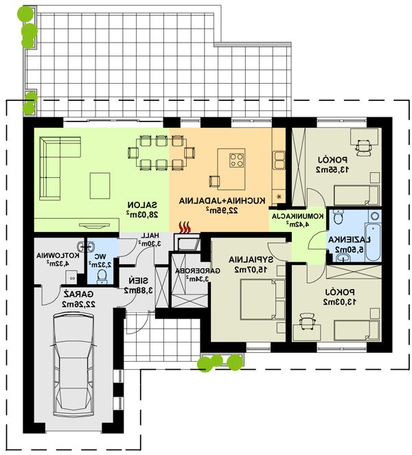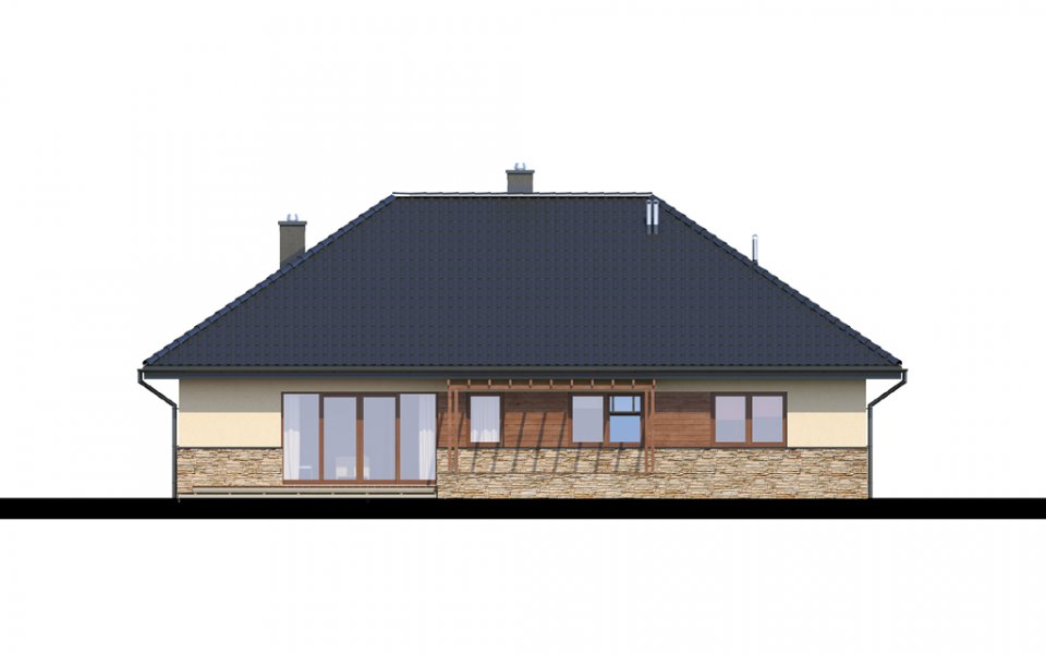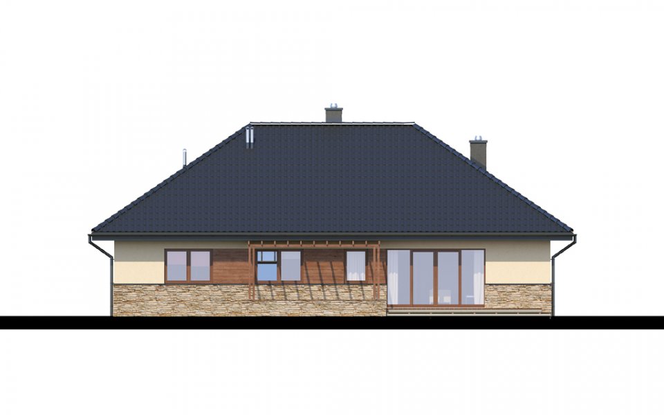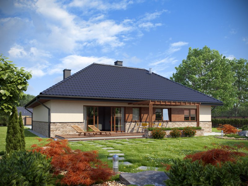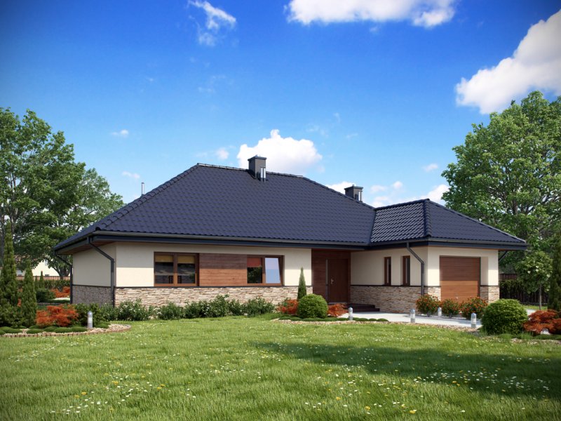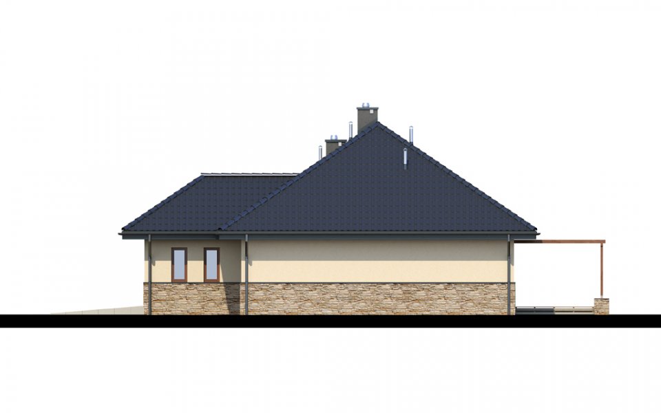 Parterowy dom o racjonalnie rozplanowanym wnętrzu. Wyposażony jest we wszystko, czego potrzebuje czteroosobowa rodzina- trzy pokoje, łazienkę, dodatkowe WC, garderobę oraz przestronny salon otwarty na kuchnię i jadalnię. Dodatkowo w domu znajduje się kotłownia i jednostanowiskowy garaż. Jest to dom o tradycyjnej bryle a elementy zieleni na pergolach oraz naturalne materiały na elewacji sprawiają, że wpasuje się on idealnie w każdy krajobraz.
