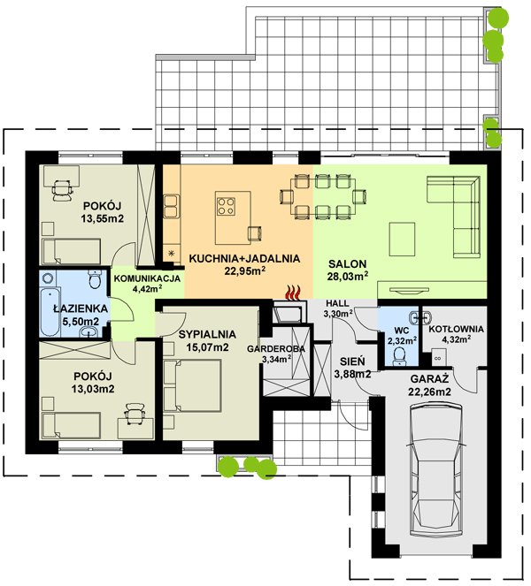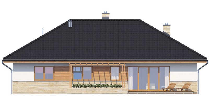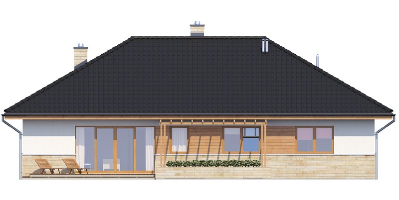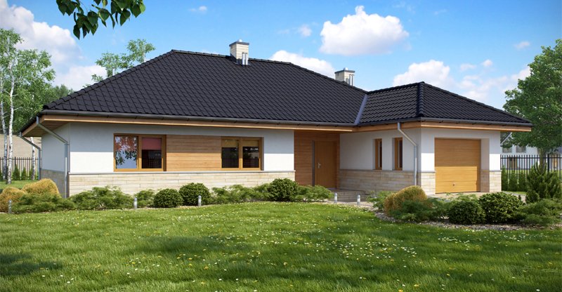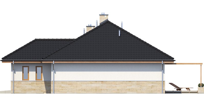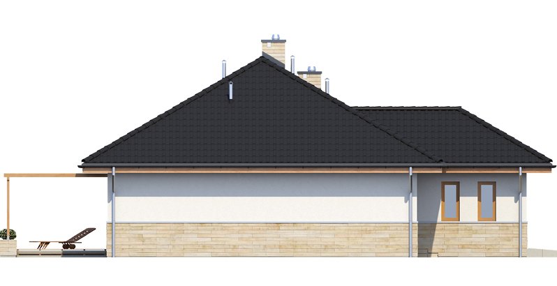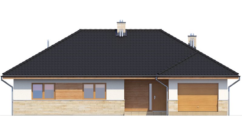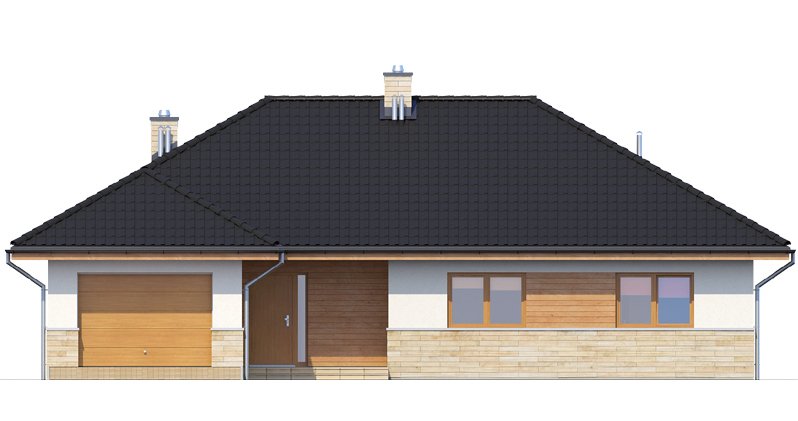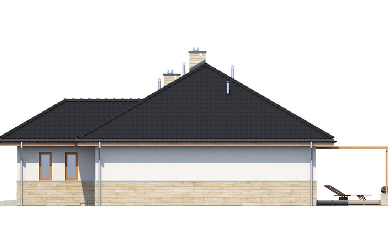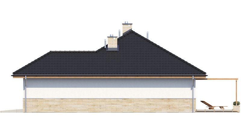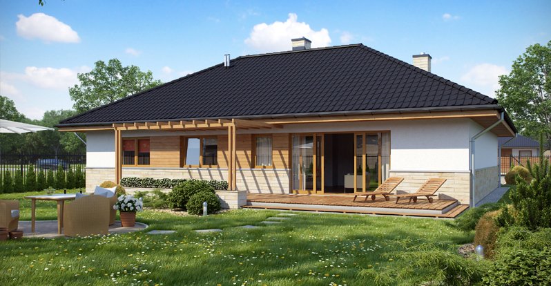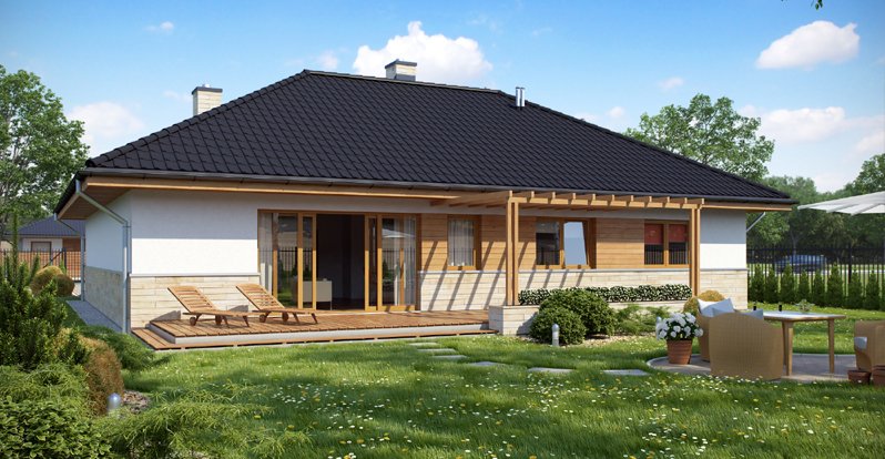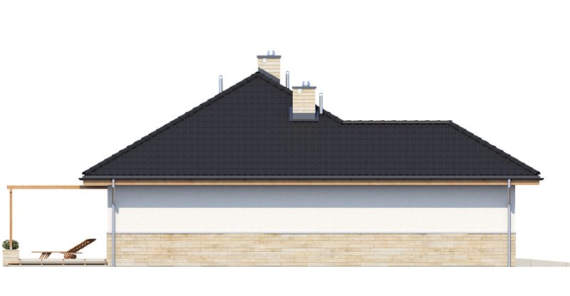 Parterowy dom o racjonalnie rozplanowanym wnętrzu. Wyposażony jest we wszystko, czego potrzebuje czteroosobowa rodzina- trzy pokoje, łazienkę, dodatkowe WC, garderobę oraz przestronny salon otwarty na kuchnię i jadalnię. Dodatkowo w domu znajduje się kotłownia i jednostanowiskowy garaż. Jest to dom o tradycyjnej bryle a elementy zieleni na pergolach oraz naturalne materiały na elewacji sprawiają, że wpasuje się on idealnie w każdy krajobraz.