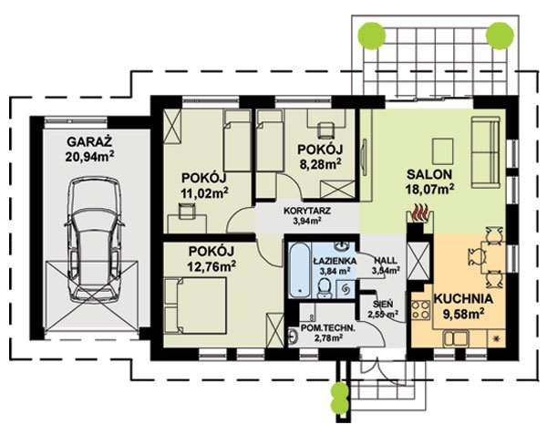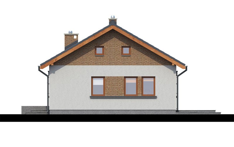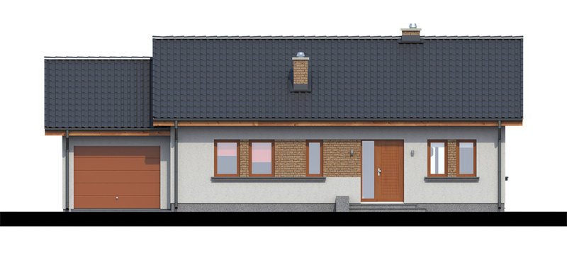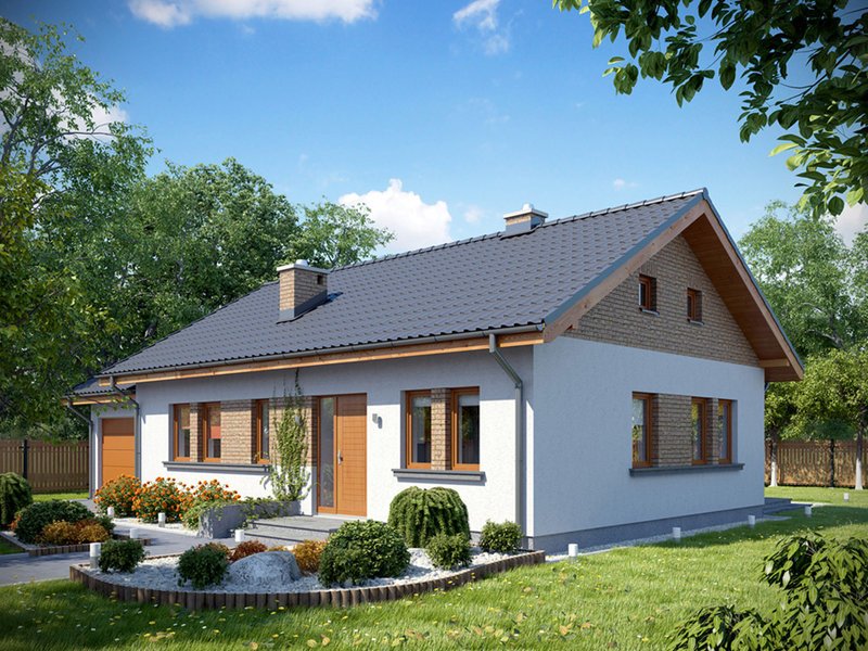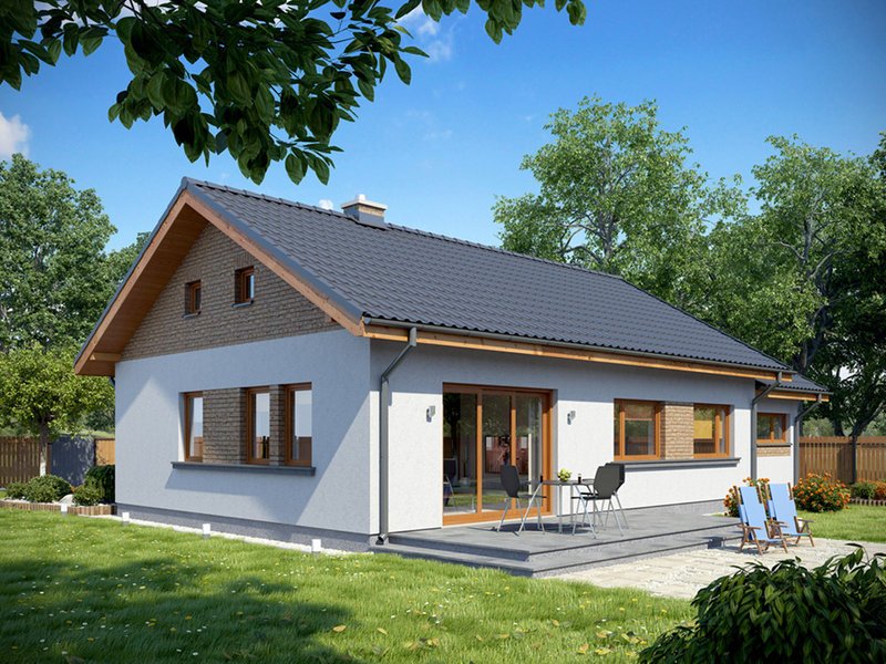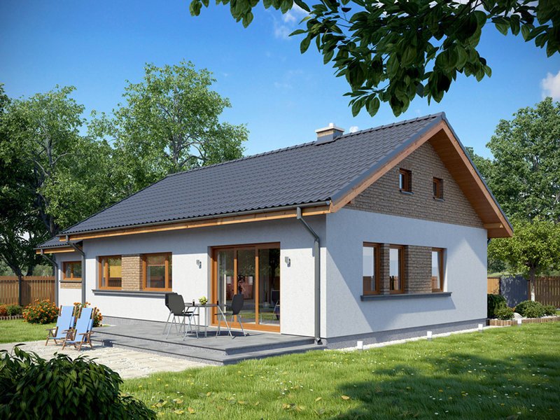 Mały, parterowy domek, w którym dzięki niezwykle funkcjonalnemu rozłożeniu pomieszczeń program użytkowy dla czteroosobowej rodziny zmieszczono na zaledwie 73,5m2. Dzięki temu zabiegowi dom jest niezwykle tani w budowie jak również, co bardzo ważne, w późniejszej eksploatacji. Dom posiada trzy sypialnie, salon, kuchnię, łazienkę oraz garaż i pomieszczenie gospodarcze.