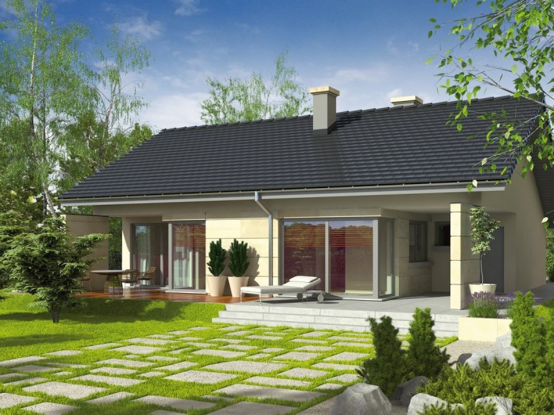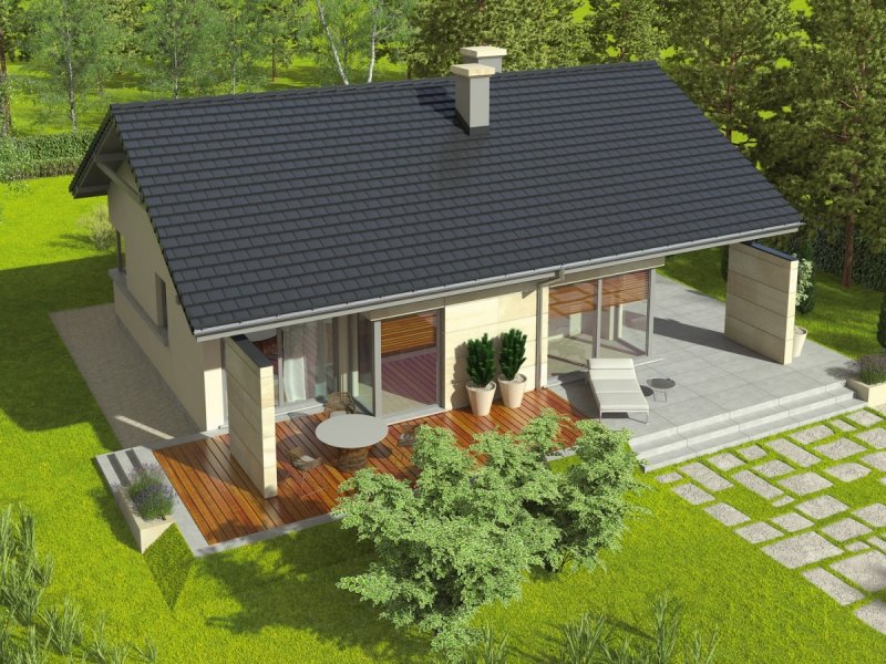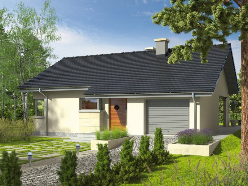 Dom parterowy, niepodpiwniczony z garażem jednostanowiskowym. Przeznaczony dla 2-3-osobowej rodziny. Układ funkcjonalny pomieszczeń pozwala na optymalne wykorzystanie przestrzeni. Strefa dzienna oraz nocna znajdują się na jednej kondygnacji. Dzięki przemyślanym rozwiązaniom są one wyraźnie rozdzielone, co sprawia, że wnętrze domu jest niezwykle komfortowe. Strefę dzienną tworzą: salon, jadalnia oraz kuchnia z praktyczną spiżarnią. Strefa nocna to dwie sypialnie i łazienka. Dodatkowo w domu znalazło się miejsce na pomieszczenie gospodarcze oraz małą toaletę. Tori G1 to doskonała propozycja dla ceniących przytulne wnętrza. Ogromnym atutem domu jest duża liczba okien, które rozświetlają wnętrze, napełniając przestrzeń dobrą, słoneczną energią. Biała elewacja podkreślona okładziną kamienną sprawia, że klasyczna bryła domu nabiera nowoczesnego wyrazu. Ciekawie zaprojektowany taras stanowi dodatkową, nastrojową strefę wypoczynkową. Istnieje możliwość adaptacji poddasza na strych.