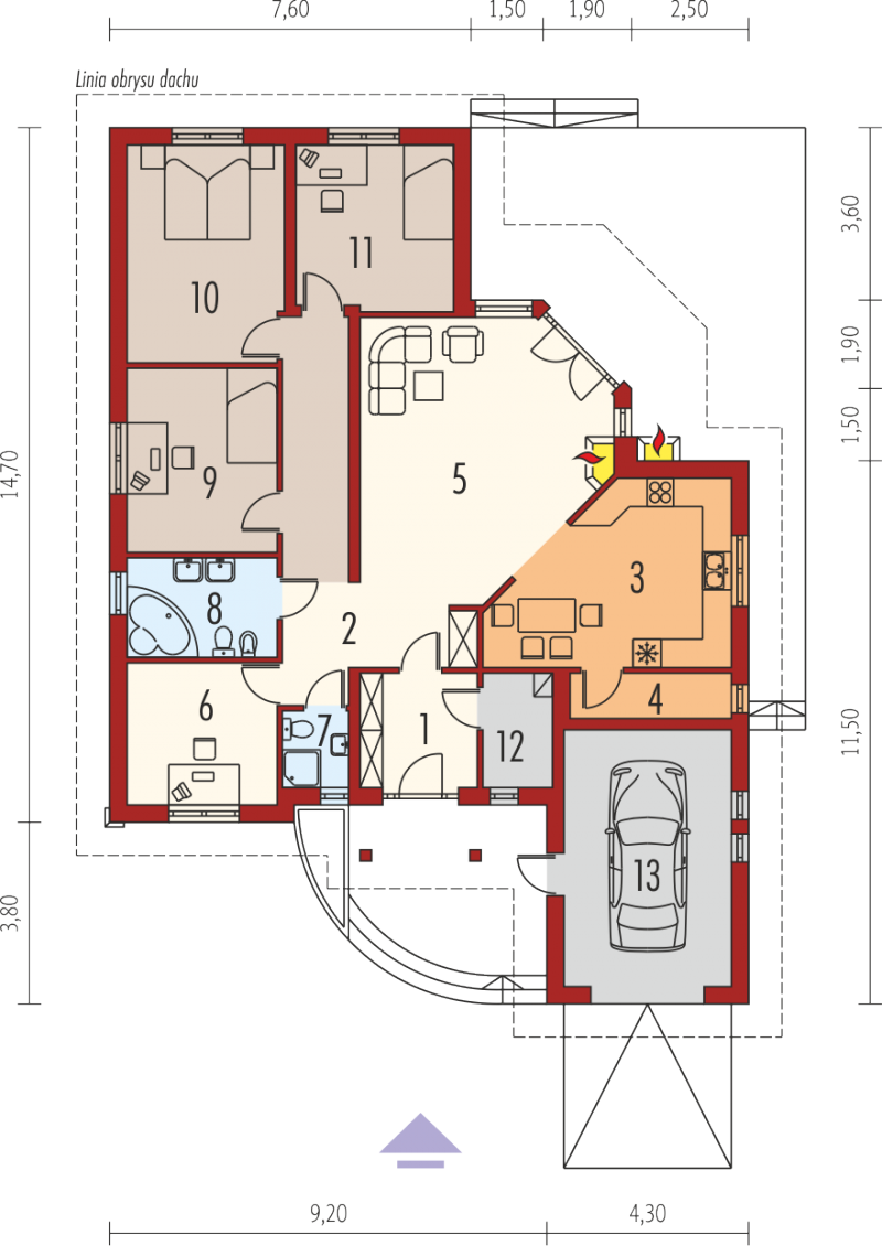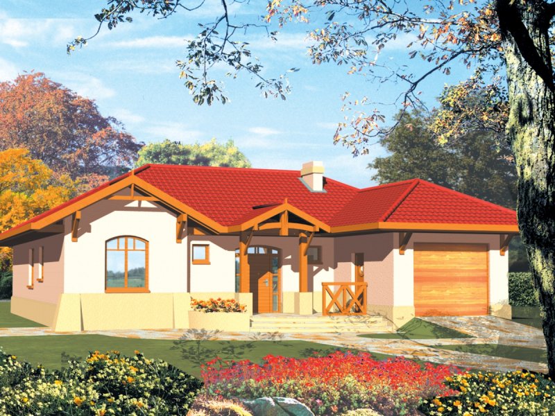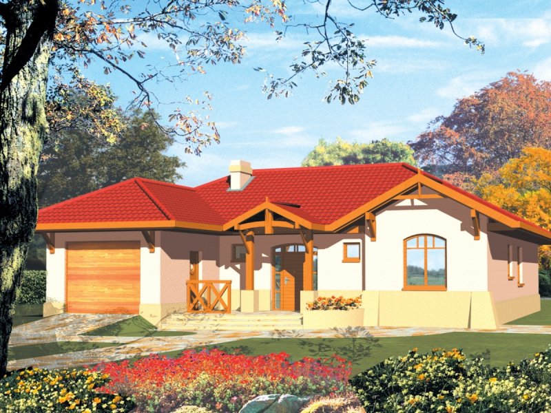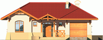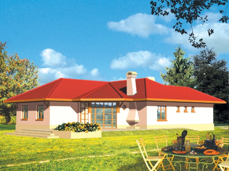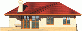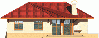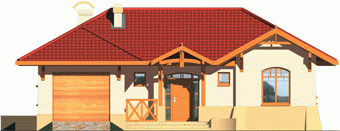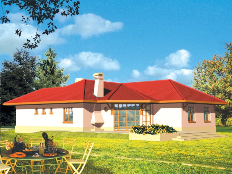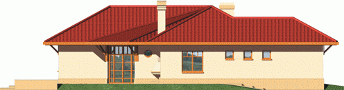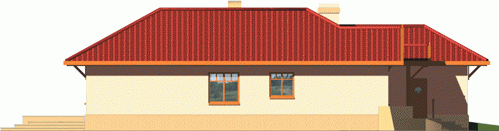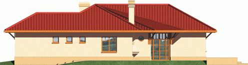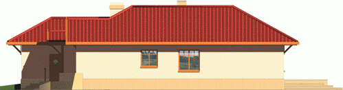 Dom parterowy niepodpiwniczony przeznaczony dla 4-osobowej rodziny. Pokój dzienny ma ciekawy nieregularny kształt. Połączony jest z kuchnią ścianką działową co umożliwia stworzenie z obydwu tych pomieszczeń jednej przestrzeni. Strefa nocna została umieszczona w lewym skrzydle domu.