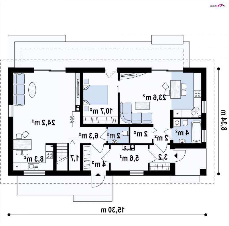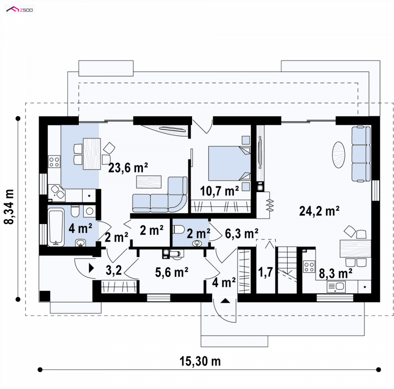 Projekt jest idealną propozycją dla rodziny wielopokoleniowej, która chce zamieszkiwać pod jednym dachem - niezwykle oszczędne i ekonomiczne, jednak często mało komfortowe rozwiązanie. W Z187 dwa różnej wielkości mieszkania połączone są jedynie wspólną kotłownią, każde posiada osobne wejście, co pozwala zachować maksimum intymności.