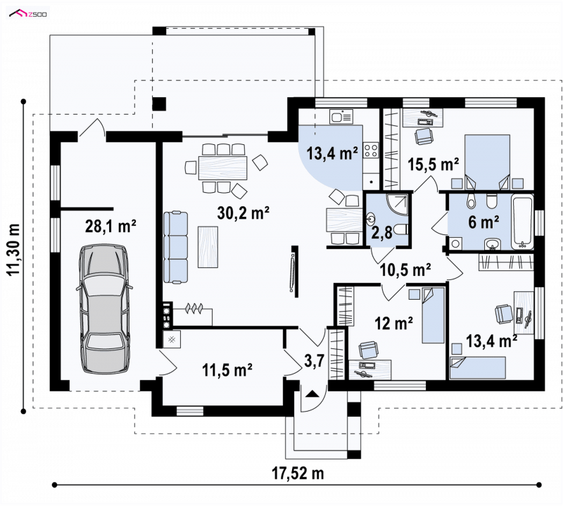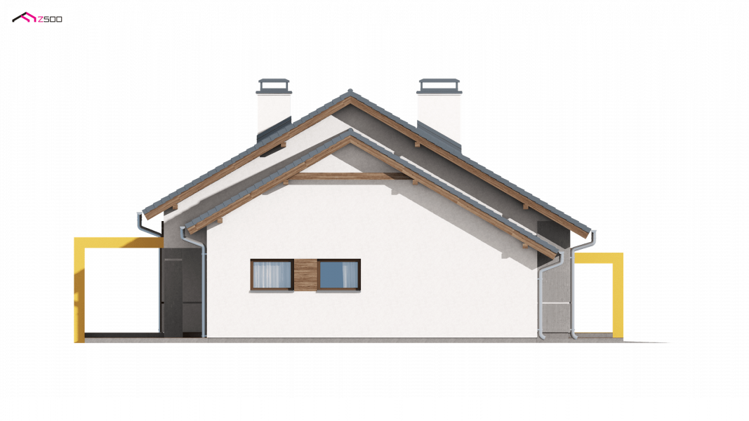 Z287 to zgrabny parterowy dom z garażem jednostanowiskowym i dużą kotłownia na paliwo stałe. Brak wewnętrznych ścian konstrukcyjnych daje wiele możliwości aranżacji i dopasowania wnętrza do indywidualnych potrzeb.