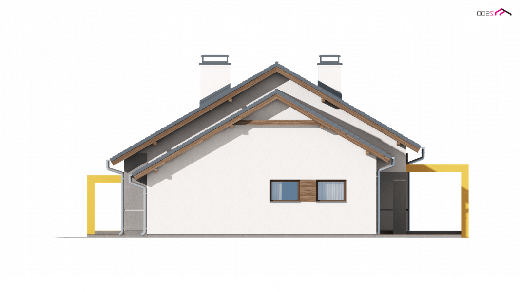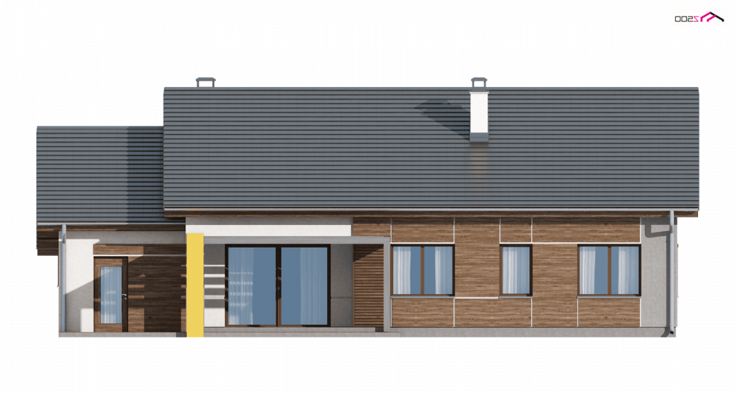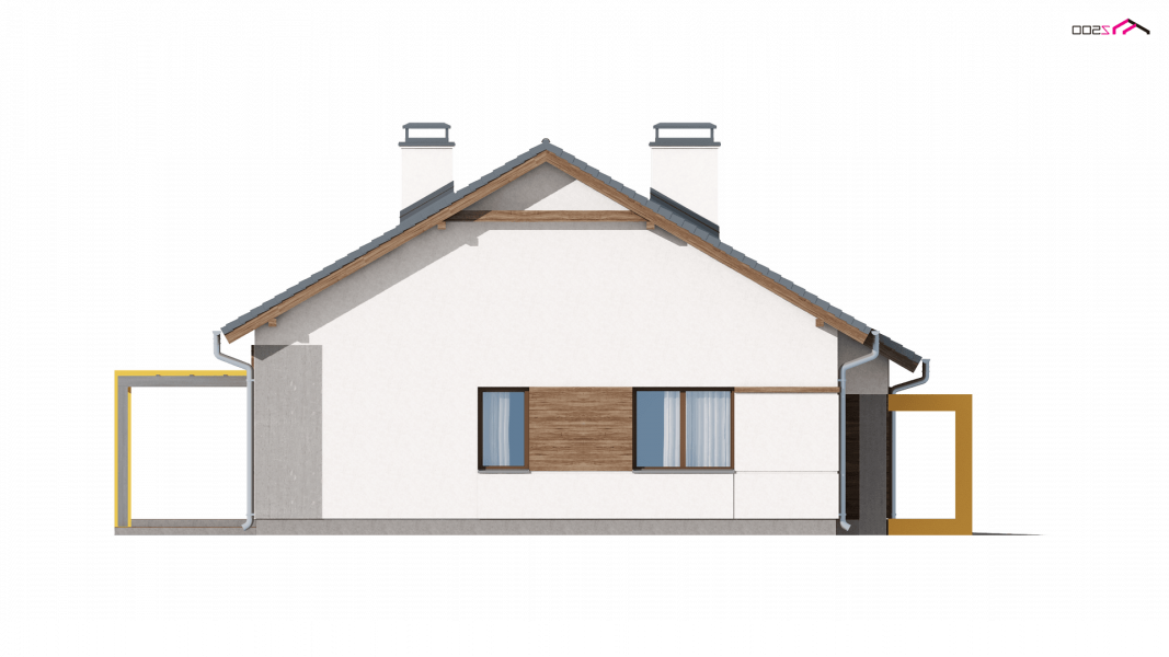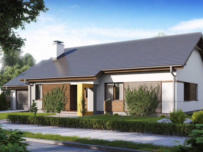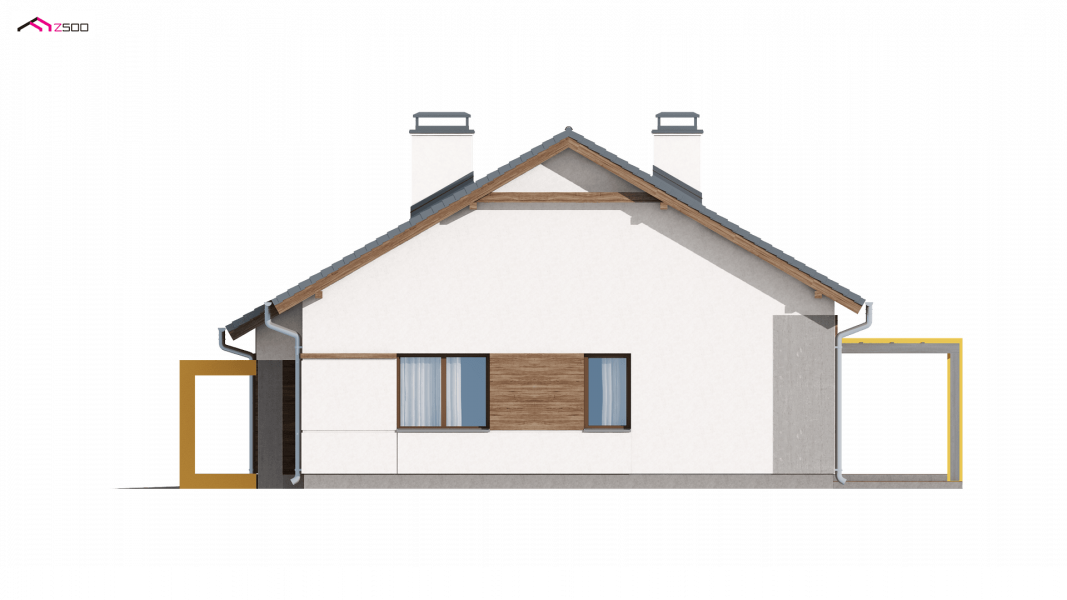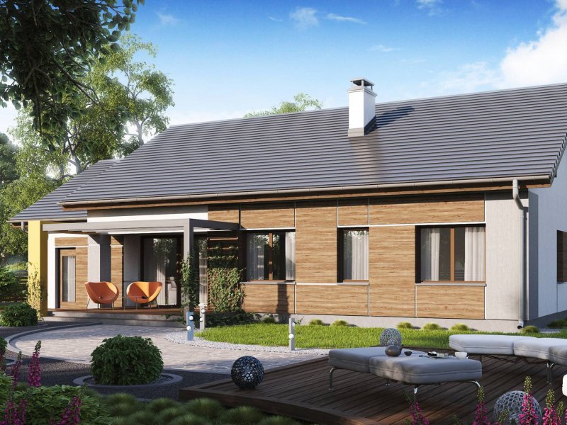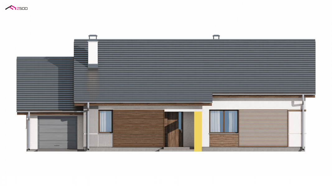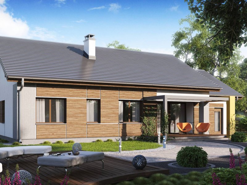 Z287 to prosty i funkcjonalny dom parterowy w nowoczesnym stylu. Ciekawe połączenie okładzin i materiałów na elewacjach dodaje mu elegancji i wdzięku. Zwarta bryła przekryta dwuspadowym dachem oraz jeden pion kominowy to racjonalne i oszczędne rozwiązanie.