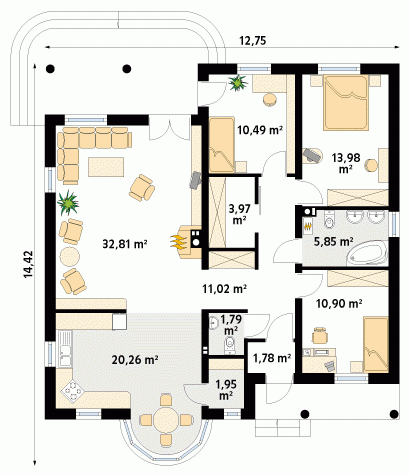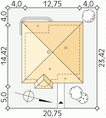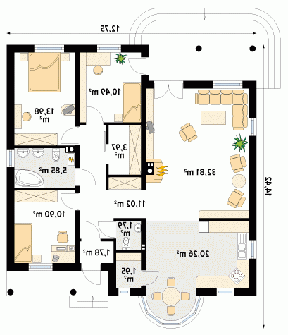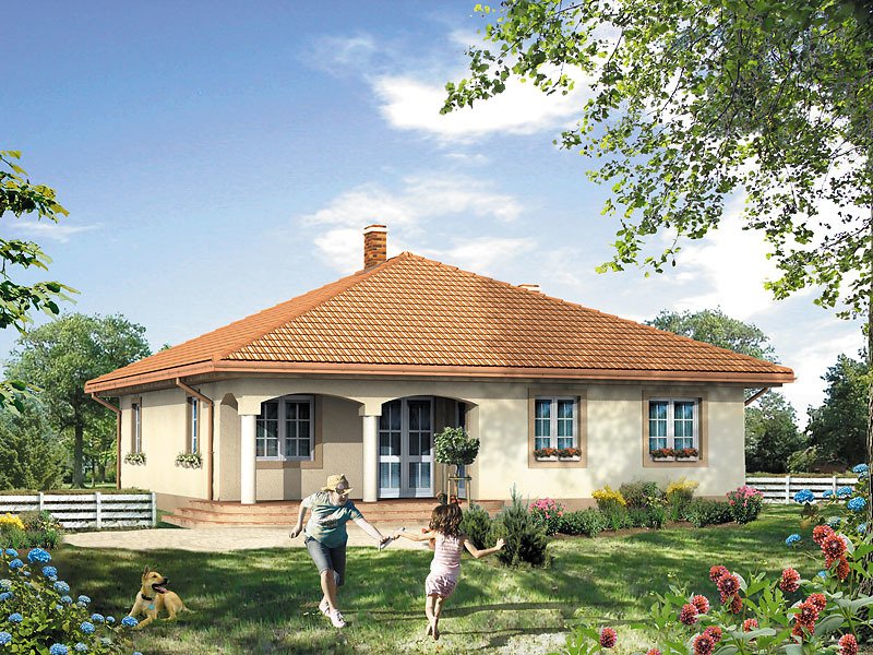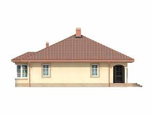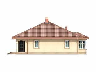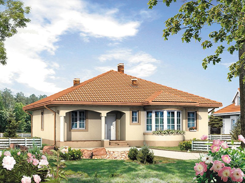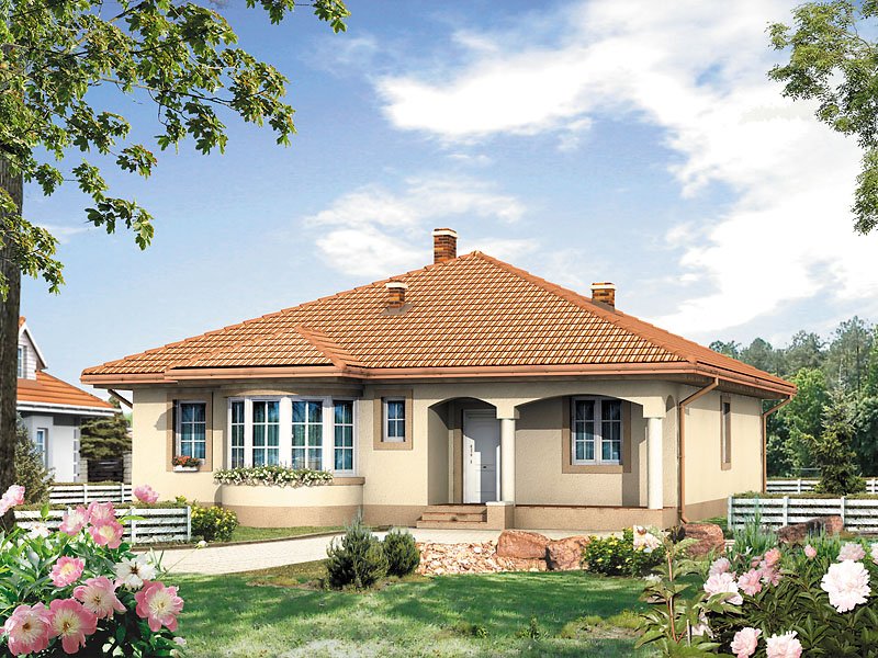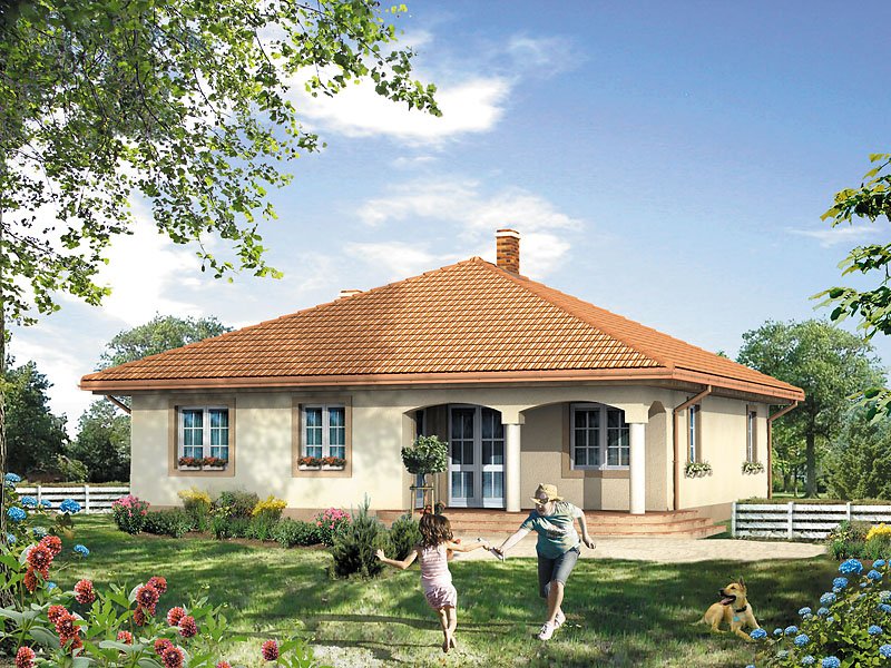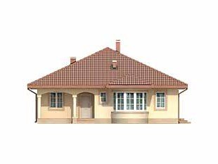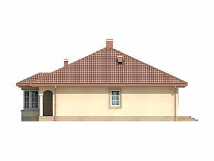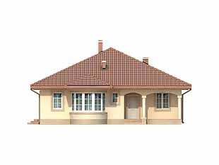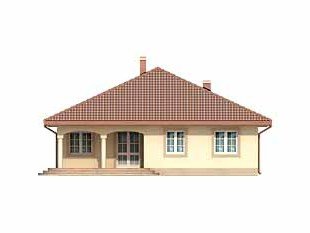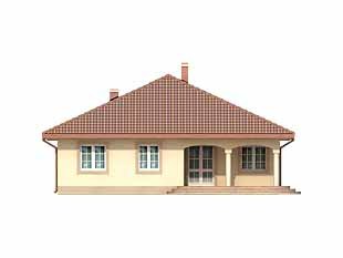 Dom jednorodzinny, parterowy, niepodpiwniczony, przeznaczony dla 4-osobowej rodziny. Na parterze zaprojektowano pokój dzienny z kominkiem, kuchnię z jadalnią w wykuszu, trzy sypialnie, łazienkę, garderobę oraz dodatkowe wc dla gości.