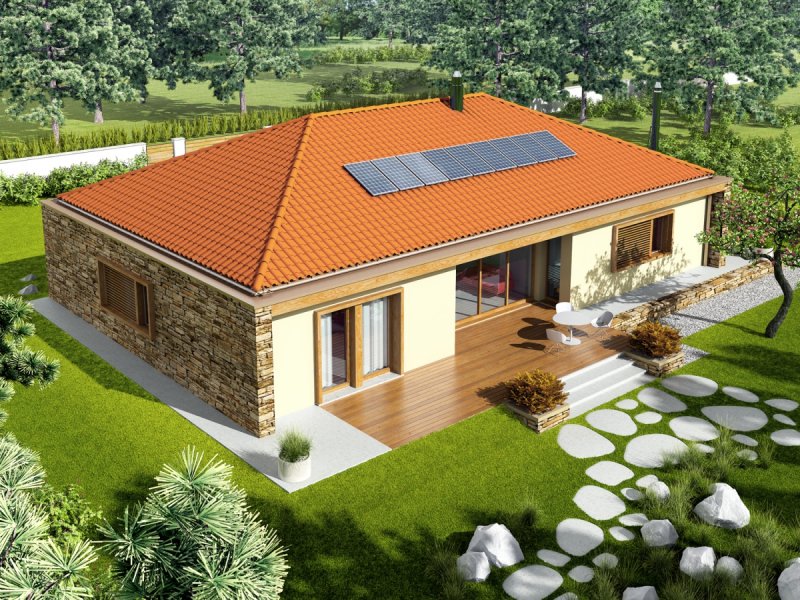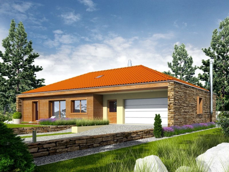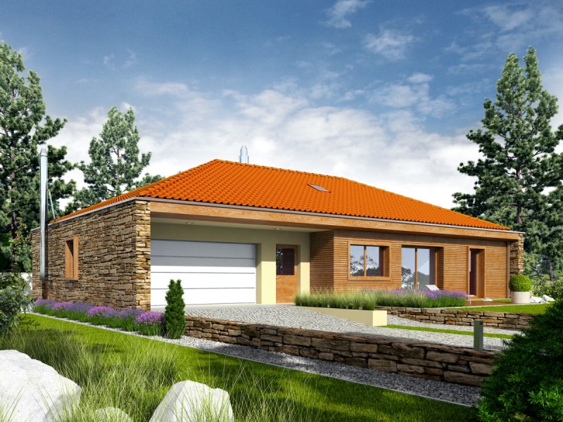 Dom parterowy, niepodpiwniczony z garażem dwustanowiskowym. Przeznaczony dla 4-5-osobowej rodziny. Strefę dzienną tworzy salon, z przestronną jadalnią oraz kuchnia ze spiżarnią. Strefa nocna to trzy wygodne sypialnie wraz z łazienką. W części technicznej znajduje się obszerne pomieszczenie gospodarcze, dostępne również z zewnątrz. EX 8 G2 (wersja D) soft to dom, obok którego nie można przejść obojętnie. Swój wyjątkowy charakter budynek zawdzięcza intrygującej kompozycji elewacji – atrakcyjny efekt wizualny tworzy udana mikstura wanilii, naturalnego drewna oraz kamienia. Wnętrze domu z reprezentacyjnym salonem spełni oczekiwania miłośników przestrzeni wypełnionych naturalnym światłem i dobrą, zieloną energią ogrodu. Projekty z serii EX soft wyposażono w standardowy zestaw instalacji: wentylację grawitacyjną i piec gazowy. Istnieje możliwość: - podpiwniczenia budynku