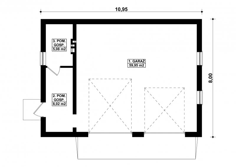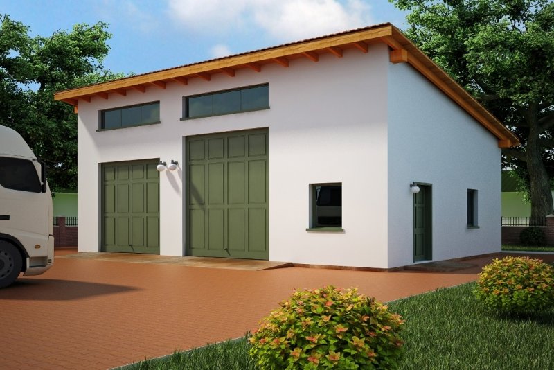 Projekt garażu dwustanowiskowego, parterowego, niepodpiwniczonego, przeznaczonego dla samochodów dostawczych i osobowych z dwoma pomieszczeniami gospodarczymi. Do projektu dołączone jest zestawienie: stali, więźby dachowej oraz stolarki drzwiowej i okiennej, jak równieżbezpłatna zgoda na dokonanie zmian.