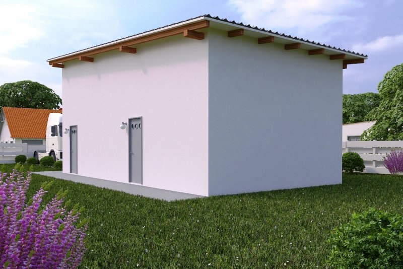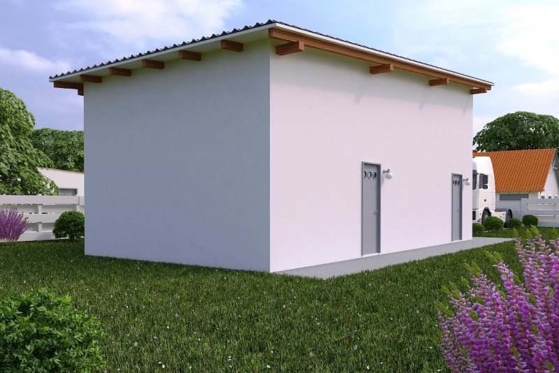 Budynek wykonany w technologii tradycyjnej. Ściany warstwowe grubości 39cm, murowane z bloczków z betonu komórkowego grubości 24cm, ocieplone styropianem grubości 15cm. Brama o wymiarach 3,00x3,60m. Więźba dachowa jednospadowa, drewniana, pokryta blachodachówką.
