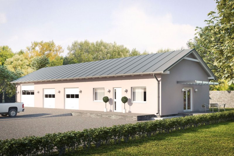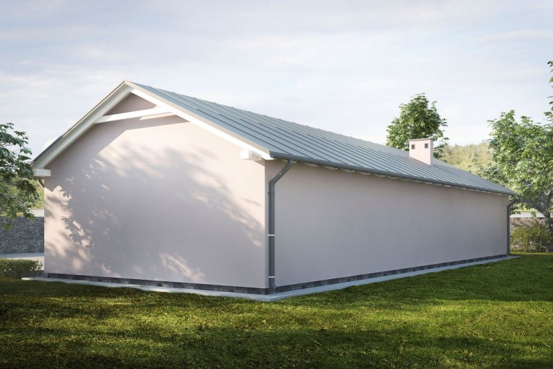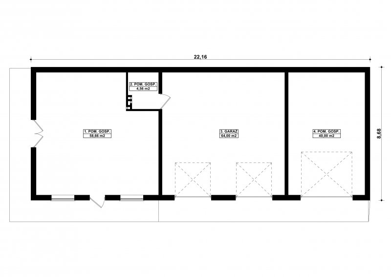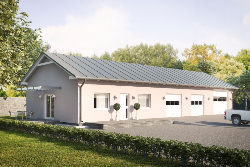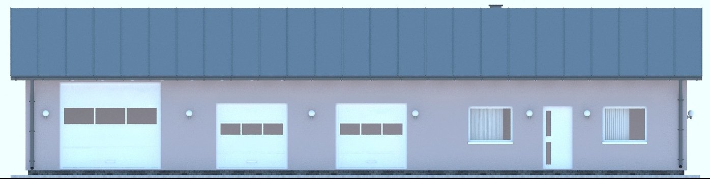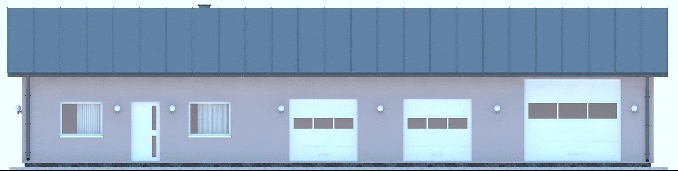 Projekt garażu trzystanowiskowego, parterowego, niepodpiwniczonego, przeznaczonego dla samochodów dostawczych i osobowych z dwoma pomieszczeniami gospodarczymi. Do projektu dołączone jest zestawienie: stali, więźby dachowej oraz stolarki drzwiowej i okiennej, jak równieżbezpłatna zgoda na dokonanie zmian.