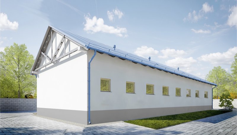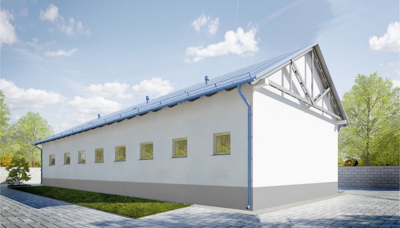 Budynek wykonany w technologii tradycyjnej. Ściany murowane z bloczków z betonu komórkowego grubości 24cm. Bramy o wymiarach 3,50x4,00m. Więźba dachowa dwuspadowa, drewniana, pokryta blachą trapezową.