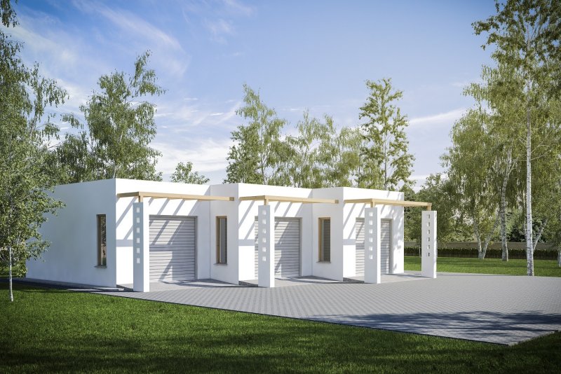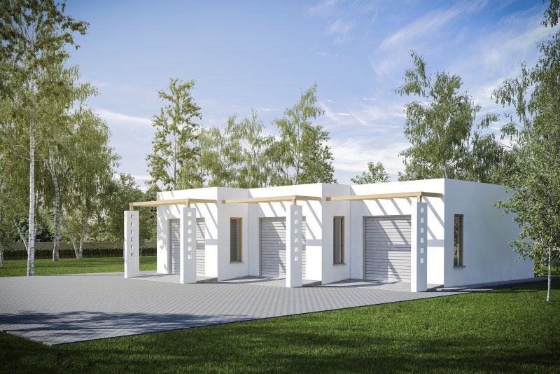 Projekt garażu trzystanowiskowego, parterowego, niepodpiwniczonego, przeznaczonego dla samochodów osobowych. Do projektu dołączone jest zestawienie: stali, więźby dachowej oraz stolarki drzwiowej i okiennej, jak również bezpłatna zgoda na dokonanie zmian.