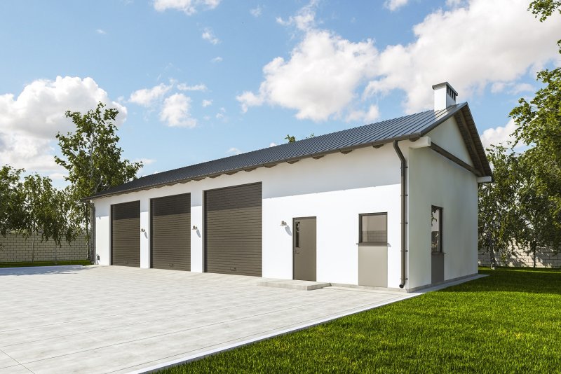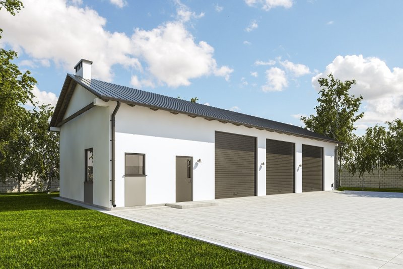 Projekt garażu trzystanowiskowego, parterowego, niepodpiwniczonego, przeznaczonego dla samochodów ciężarowych z dwoma pomieszczeniami gospodarczymi i WC. Do projektu dołączone jest zestawienie: stali, więźby dachowej oraz stolarki drzwiowej i okiennej, jak również bezpłatna zgoda na dokonanie zmian.
