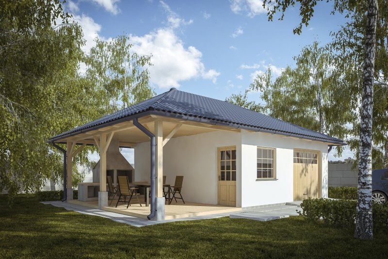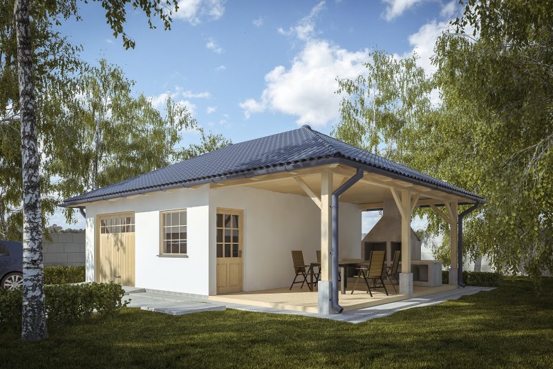 Projekt garażu jednostanowiskowego, parterowego, niepodpiwniczonego, przeznaczonego dla samochodów osobowych z dwoma pomieszczeniami gospodarczymi. Do projektu dołączone jest zestawienie: stali, więźby dachowej oraz stolarki drzwiowej i okiennej, jak również bezpłatna zgoda na dokonanie zmian.