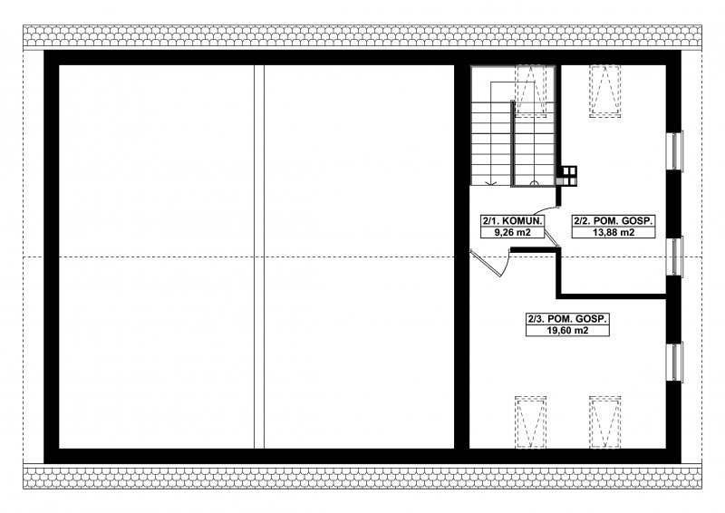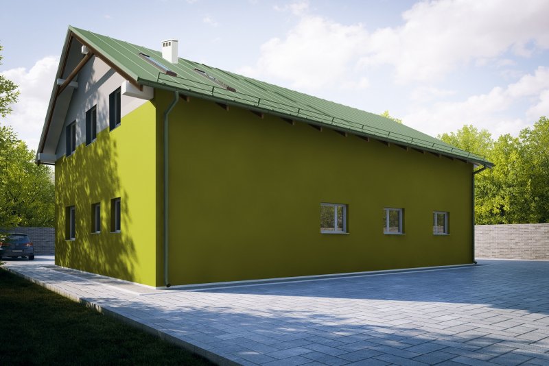 Projekt garażu dwustanowiskowego, parterowego, niepodpiwniczonego z poddaszem użytkowym, przeznaczonego dla samochodów dostawczych z trzema z pomieszczeniami gospodarczymi i WC. Do projektu dołączone jest zestawienie: stali, więźby dachowej oraz stolarki drzwiowej i okiennej, jak również bezpłatna zgoda na dokonanie zmian.