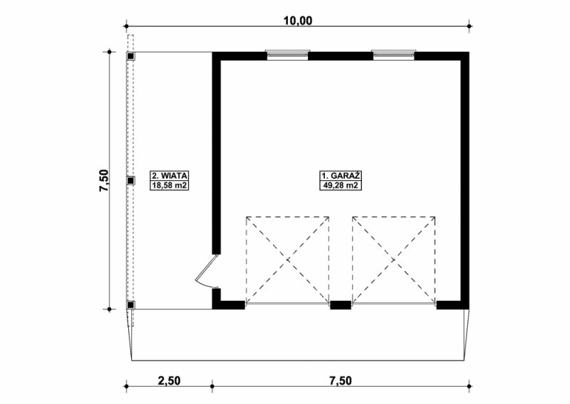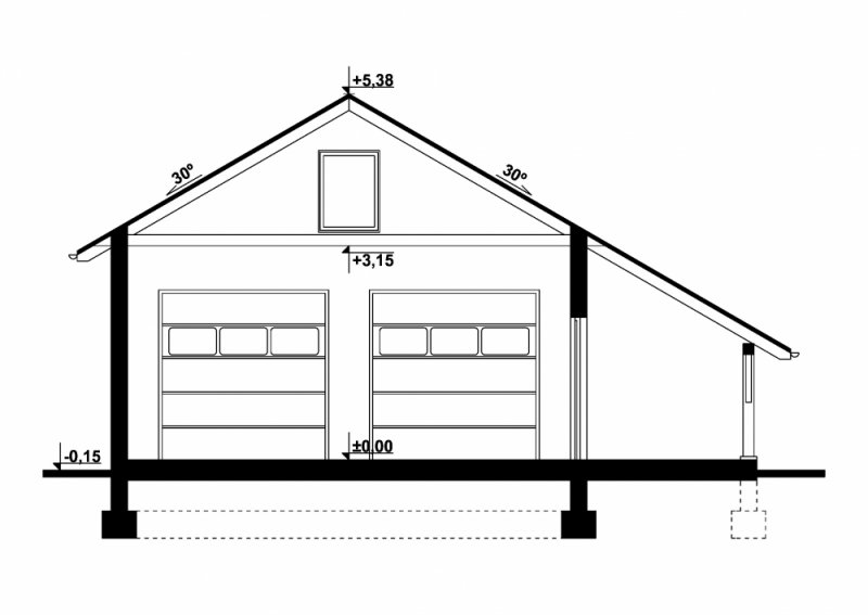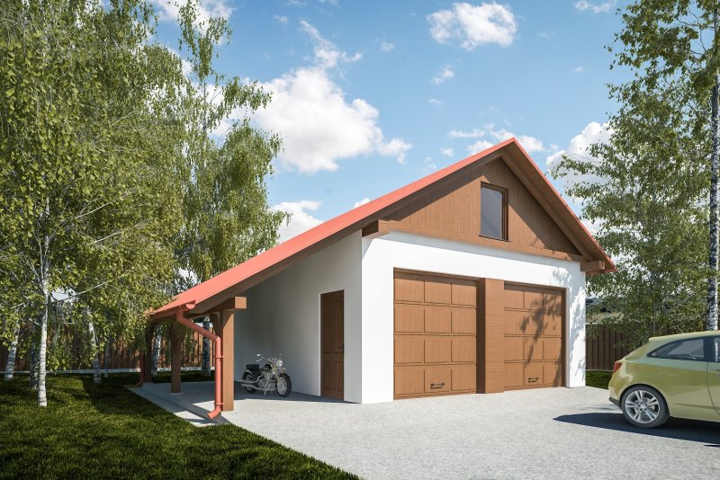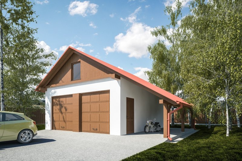 Projekt garażu dwustanowiskowego, parterowego, niepodpiwniczonego, przeznaczonego dla samochodów osobowych z wiatą. Do projektu dołączone jest zestawienie: stali, więźby dachowej oraz stolarki drzwiowej i okiennej, jak również bezpłatna zgoda na dokonanie zmian