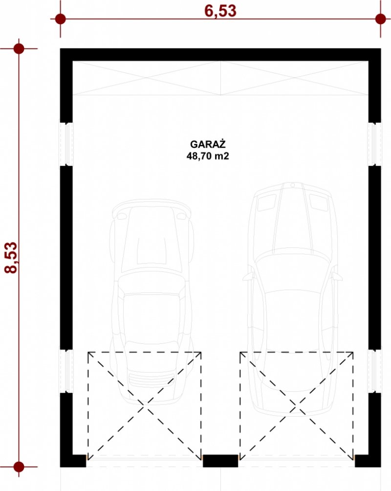 Projekt garażu dwustanowiskowego, parterowego, niepodpiwniczonego, przeznaczonego dla samochodów osobowych. Do projektu dołączone jest zestawienie: stali, więźby dachowej oraz stolarki drzwiowej i okiennej, jak równieżbezpłatna zgoda na dokonanie zmian.