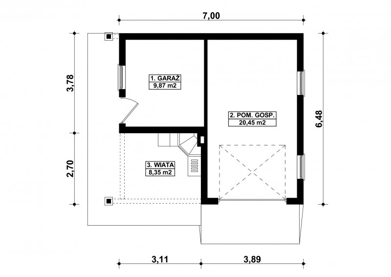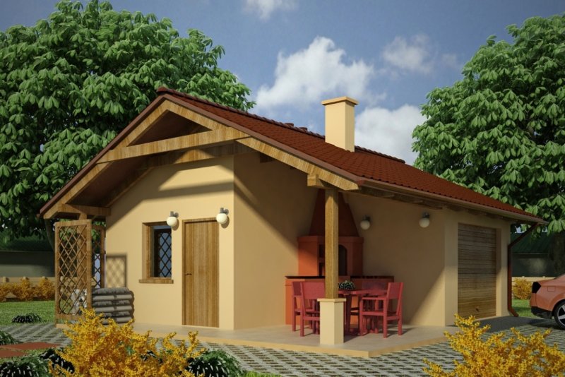 Projekt garażu jednostanowiskowego, parterowego, niepodpiwniczonego, przeznaczonego dla samochodów osobowych z pomieszczeniem gospodarczym i wiatą z kominkiem. Do projektu dołączone jest zestawienie: stali, więźby dachowej oraz stolarki drzwiowej i okiennej, jak równieżbezpłatna zgoda na dokonanie zmian.