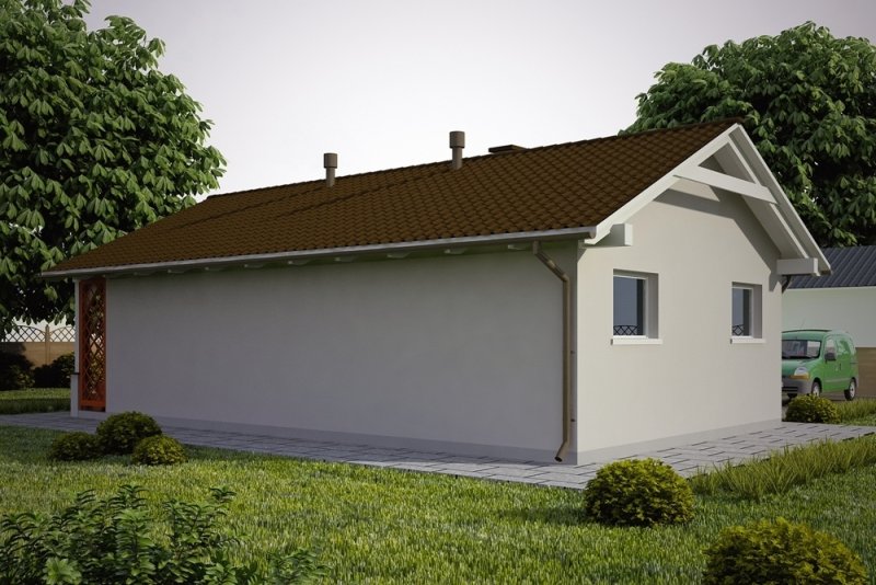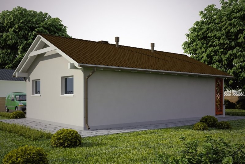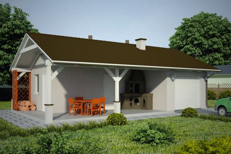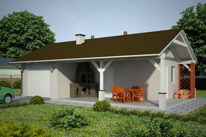 Projekt garażu jednostanowiskowego, parterowego, niepodpiwniczonego, przeznaczonego dla samochodów osobowych z dwoma pomieszczeniami gospodarczymi i wiatą z kominkiem. Do projektu dołączone jest zestawienie: stali, więźby dachowej oraz stolarki drzwiowej i okiennej, jak równieżbezpłatna zgoda na dokonanie zmian.
