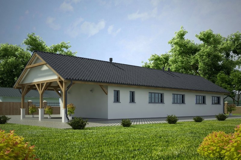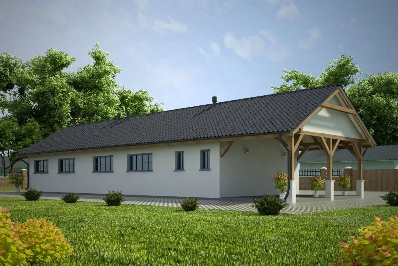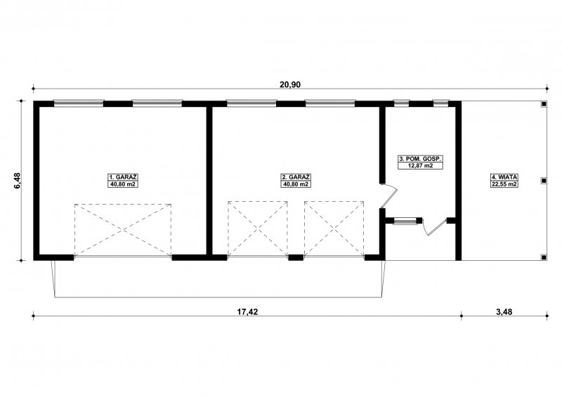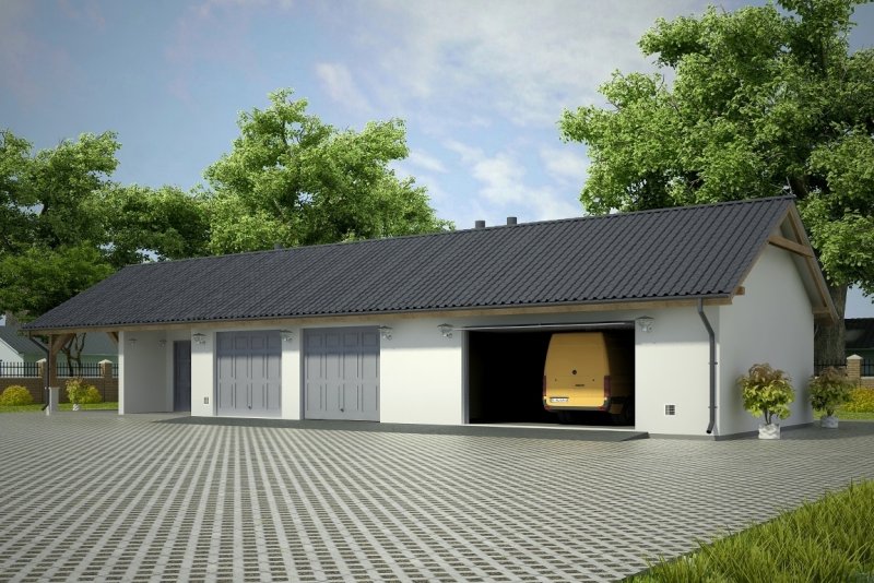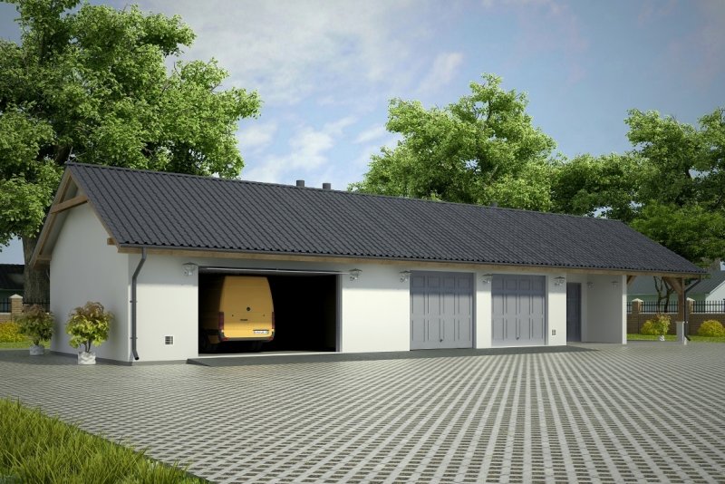 Projekt garażu czterostanowiskowego, parterowego, niepodpiwniczonego, przeznaczonego dla samochodów osobowych z pomieszczeniem gospodarczym i wiatą. Do projektu dołączone jest zestawienie: stali, więźby dachowej oraz stolarki drzwiowej i okiennej, jak równieżbezpłatna zgoda na dokonanie zmian.