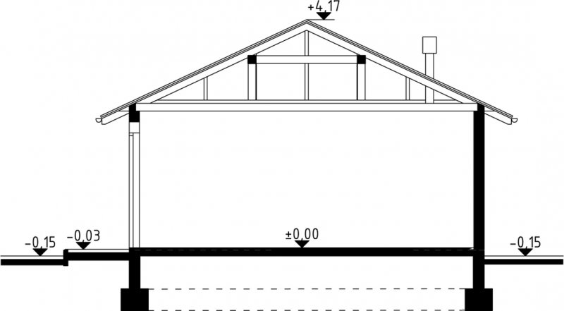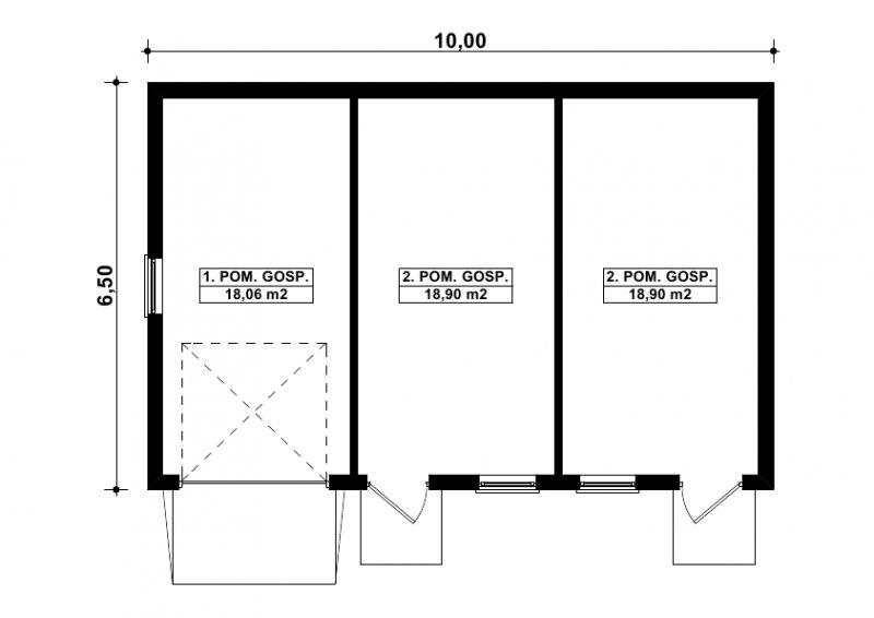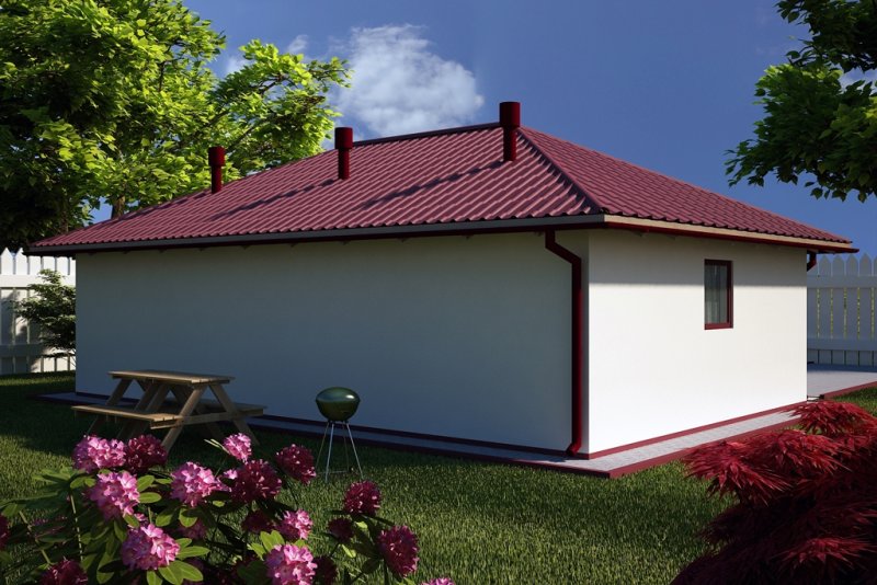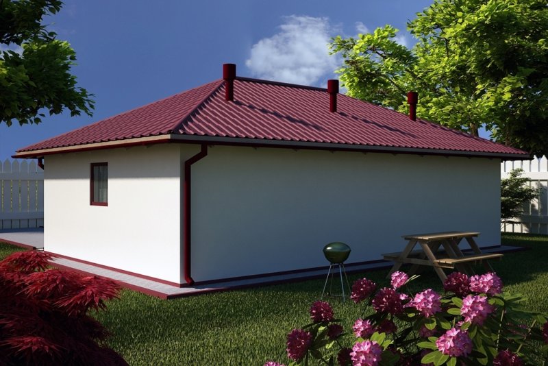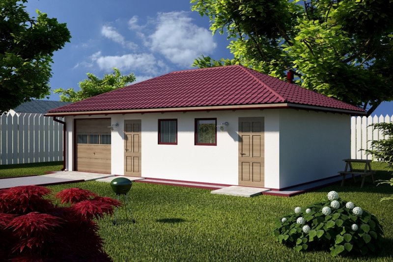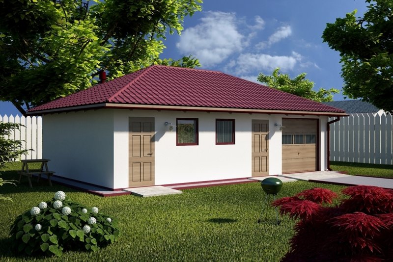 Projekt budynku parterowego, niepodpiwniczonego, z trzema pomieszczeniami gospodarczymi. Do projektu dołączone jest zestawienie: stali, więźby dachowej oraz stolarki drzwiowej i okiennej, jak równieżbezpłatna zgoda na dokonanie zmian.
