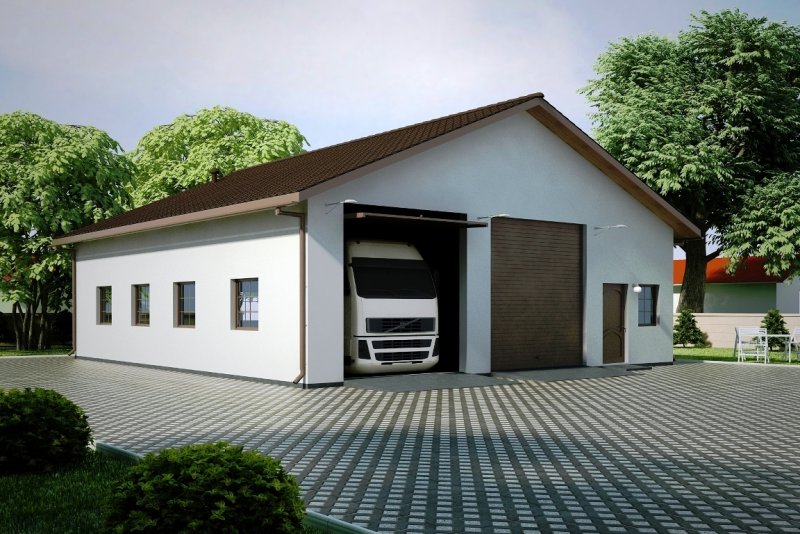 Projekt garażu dwustanowiskowego, parterowego, niepodpiwniczonego, przeznaczonego dla samochodów dostawczych z trzema pomieszczeniami gospodarczymi. Do projektu dołączone jest zestawienie: stali, więźby dachowej oraz stolarki drzwiowej i okiennej, jak równieżbezpłatna zgoda na dokonanie zmian.