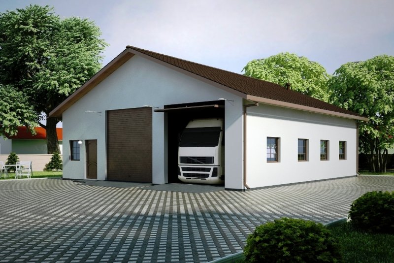 Budynek wykonany w technologii tradycyjnej Ściany murowane z pustaków ceramicznych „POROTHERM” grubości 25cm i cegły kratówki grubości 12cm. Bramy o wymiarach 3,20x3,75m. Więźba dachowa dwuspadowa, drewniana, pokryta blachodachówką.